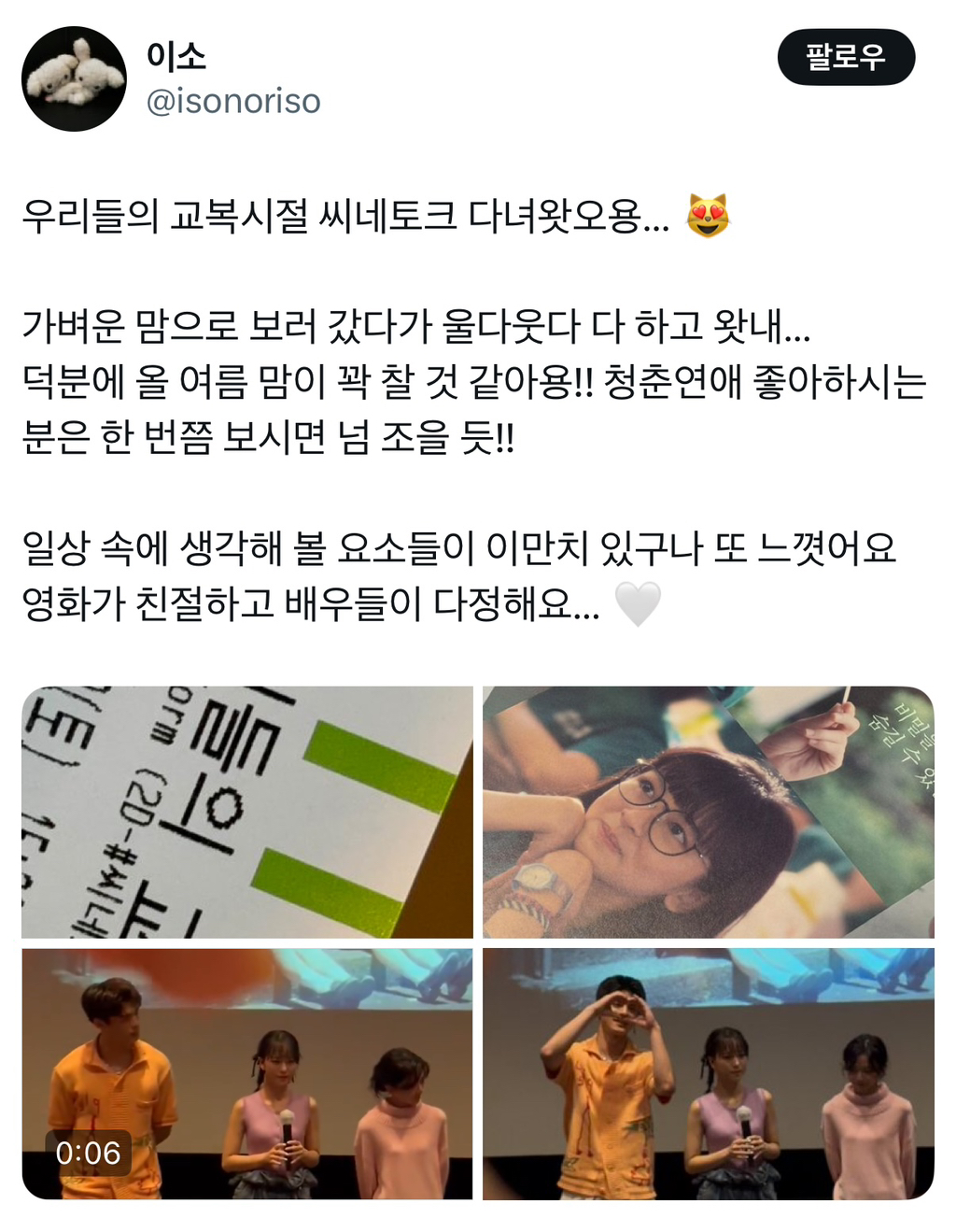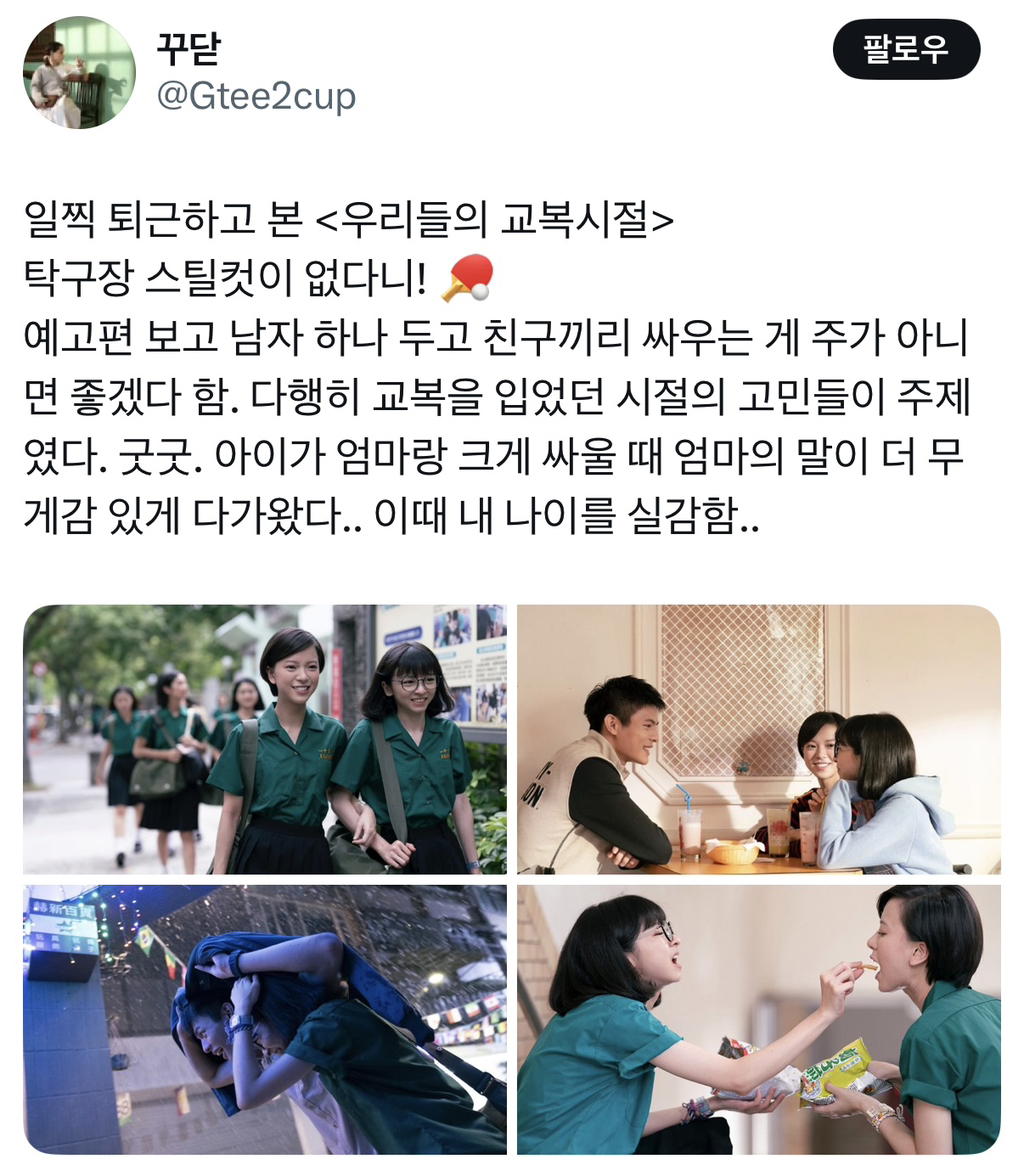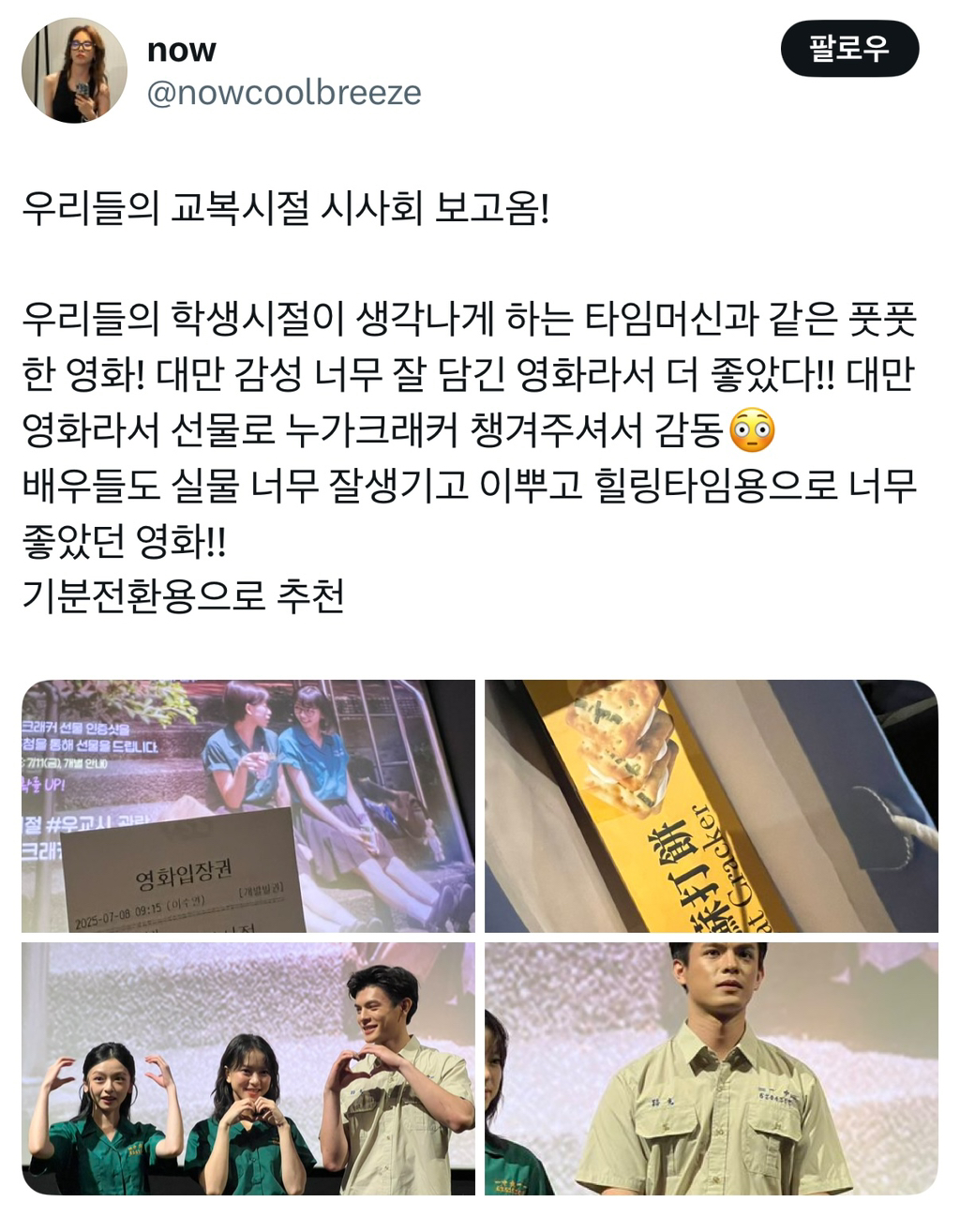 [흥미돋]소녀들한테 반응 좋은 영화 <우리들의교복시절> 후기 모음.twt 작성자퇴근응급|작성시간25.07.18|조회수10,376 목록 댓글 8 글자크기 작게가 글자크기 크게가 출처: 여성시대 (퇴근응급)대만 교복 입고 무대인사 넘 귀엽다 ㅋㅋㅋ 다음검색 현재 게시글 추가 기능 열기 북마크 공유하기 신고 센터로 신고 댓글 댓글 8 댓글쓰기 답글쓰기 댓글 리스트 작성자우남 | 작성시간 25.07.18 재밌겠다 작성자보라빛 정수정 | 작성시간 25.07.18 이거 보고싶은데 근처에 하는 곳이 없어ㅠㅠ 작성자곤드레밥길들이기 | 작성시간 25.07.18 여주 진짜 사랑스러움ㅠ로맨스물로 끝나지않아서 좋았어 작성자히노끼사탕 | 작성시간 25.07.18 이거 부국제에서 봤는데 재밋더라 작성자27373838822724 | 작성시간 25.07.19 나 오늘봤는데 진짜 개애애애애재밌더라 댓글 전체보기