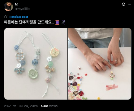 [흥미돋]요즘 찐으로 유행이라는 단추 키링 만들기.jpg 작성자바나나스플릿구슬|작성시간25.07.21|조회수88,064 목록 댓글 66 글자크기 작게가 글자크기 크게가 출처: https://theqoo.net/square/3835001983?page=3더쿠 - 요즘 찐으로 유행이라는 단추 키링 만들기.jpghttps://x.com/myoiiiie/status/1946808030940807207 만드는 법 https://www.youtube.com/shorts/XT04LZT55oA https://www.instagram.com/p/DL14xOmp177 가볍고 만들기 쉽고 귀여워서 많이 만드는듯 만들어서 폰에도 달고 가방에도 달고theqoo.net https://x.com/myoiiiie/status/1946808030940807207X의 묘님(@myoiiiie)여름에는 단추키링을 만드세요 .. 🧵🪡x.comhttps://youtu.be/XT04LZT55oA?si=39SHnwxNRiteTrQR Instagram에서 이 게시물 보기 오뭐입?(@onl_ootd_)님의 공유 게시물 다음검색 현재 게시글 추가 기능 열기 북마크 공유하기 신고 센터로 신고 댓글 댓글 66 댓글쓰기 답글쓰기 댓글 리스트 작성자비치비치비치해변 | 작성시간 25.07.21 헐 귀여워 작성자오아리 | 작성시간 25.07.21 귀엽다 작성자모승이._. | 작성시간 25.07.21 나 만들어줄사람 작성자무둥이 | 작성시간 25.07.21 개귀여워!!!! 작성자나그참파 | 작성시간 25.07.21 와 나 진짜 유행이랑 멀어지긴했나봐 ㅋㅋㅋㅋ 옛날엔 그게 뭔데? 왜하는데? 이런식으로 이해못받는 입장이었는데 지금은 내가 단추? 단추를 왜? 왜달고다니지?? 이러면서 봄 ㅋㅋㅋㅋ 별개로 귀엽고 예쁘긴하다 댓글 전체보기