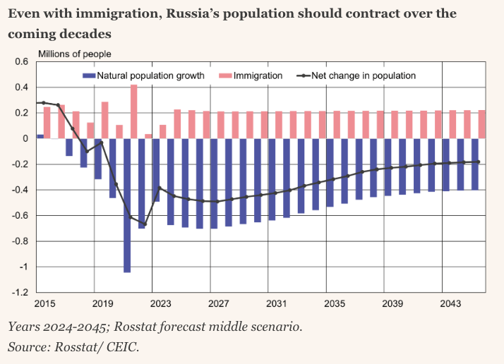 여기에 우크라이나 전쟁까지 터지며 러시아 미래의 기반이 되어야할 젊은 남성 상당수가 갈려나가고 출산율이 떨어졌을뿐 아니라 전시 경제 효과로 일시적인 성장률 반등은 보였을지언정 다시 저성장이 고착화되는 모습임.