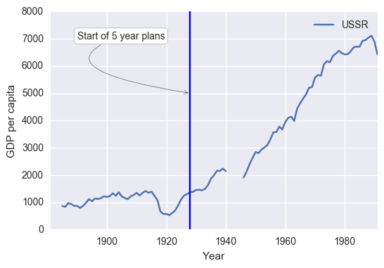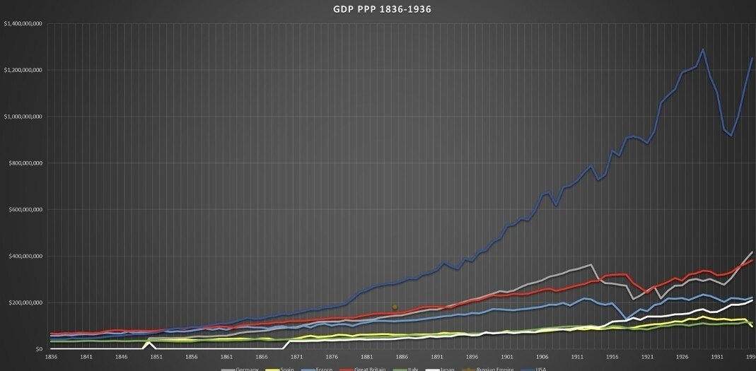 [ 1836-1936년 GDP 변화: 진파랑 ( 미국 ), 회색 ( 독일 ), 빨강 ( 영국), 하늘 ( 프랑스 ), 하양 ( 일본 ), 노랑 ( 일본 ), 연두 ( 이탈리아 ) ]