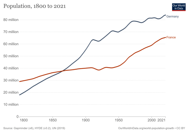 그러나, 19세기 이후 프로이센 주도의 독일 통일과 라이벌이였던 프랑스 대비 급격한 산업화와 인구 팽창을 통해 유럽 대륙 제일 가는 국력을 가진 국가로 거듭났음.