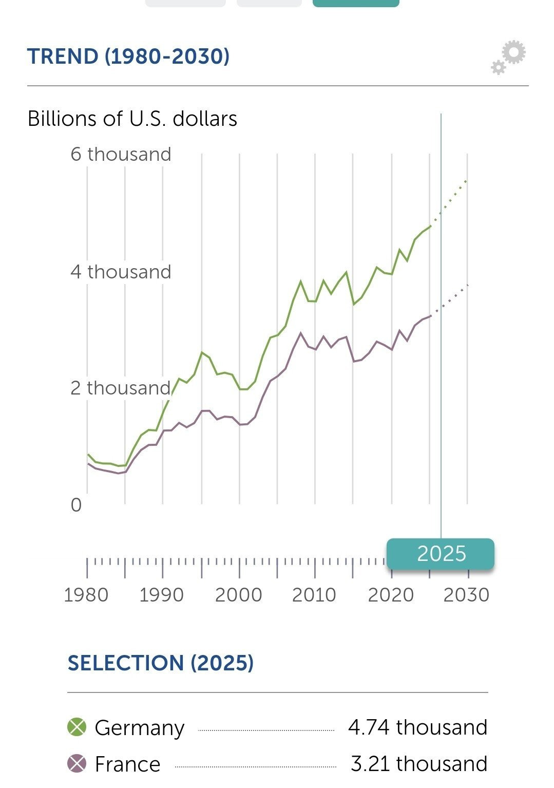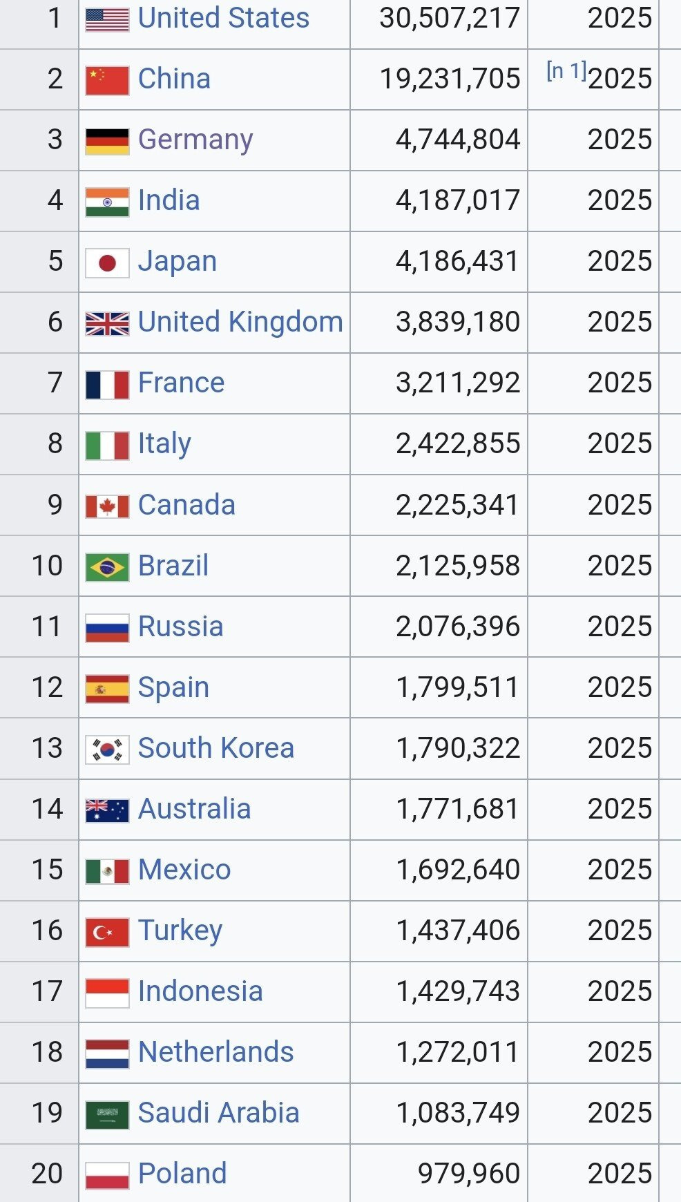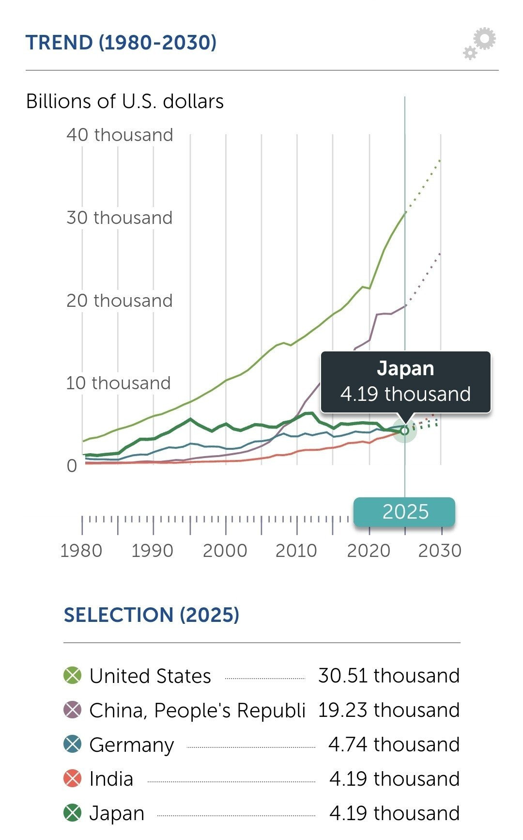 게다가 미국은 2% 후반대 3% 성장하고 중국은 중진국 함정 빠지며 더 급속한 일본식의 장기침체로 쪼그라드는게 바이든때까지만 해도 되고 있었으나 트럼프가 관세전쟁도 실패해 중국 성장률은 크게 타격 못준 반면 미국 성장률만 1% 대로 하락시켜버림.
