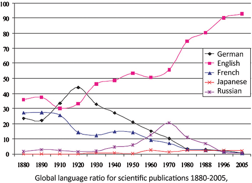 한 때 독일어는 과학 특히 화학의 언어라고 불릴 정도였으며 독일어권에서의 과학 논문 비중이 20세기초만 해도 영어권보다 높았을때가 존재했음. 실제로 MIT만해도 1930년대까지 독일어는 필수였고.