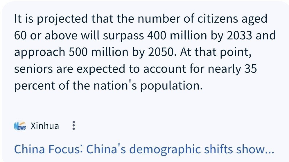사실 이것도 위에서 말한 초저출산과 그로 인한 세계 최고속, 최대 수준의 고령화로 작년 노인 3억에 2033년 노인 4억까지 찍으며 중진국 함정이란 수렁에 빠져 나가리 되는 수순이었음.