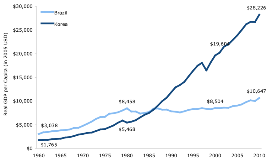 브라질은 중의적인 의미로 잠재력의 국가라 불리는데 잠재력은 넘쳐나지만 그걸 현실화 시키지 못했다는 의미. 분명 스타트 자체는 남미 최대의 영토와 인구에 압도적인 사탕수수등 상품작물 생산등 제반조건 자체는 괜찮았음.