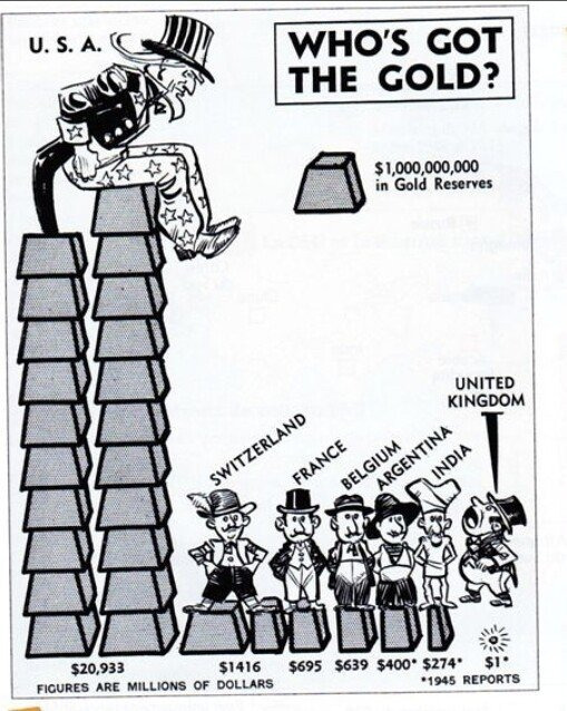 IMF, 세계 은행, UN 등 여러 기구들이 미국의 뒷배로 세워졌고 당시 세계 금의 대부분을 가지고 있으며 세계 경제력과 공업력의 약 42% 에 달하던 미국이 주도하는 세계질서 변화에 큰 타격을 입음.