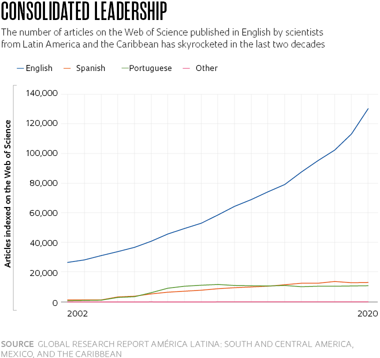 [ 라틴 아메리카내 언어별 과학 학술지 출판량 ]