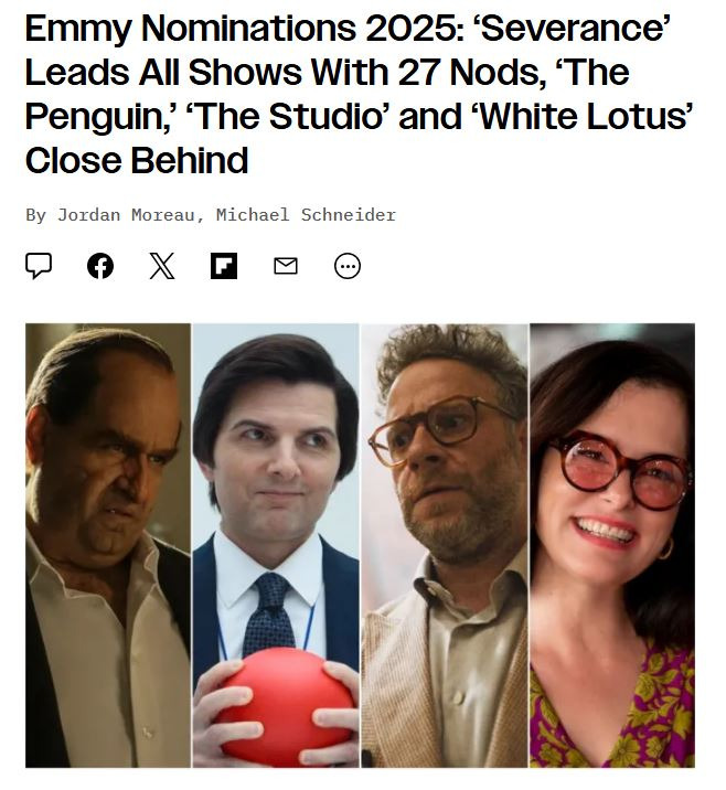 2025 에미상 후보작 발표: [세브란스: 단절], 27개 부문 지명으로 전체 1위, [더 펭귄], [더 스튜디오], [화이트 로투스]가 뒤이어