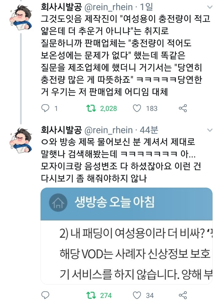 작성자몇요일 작성시간 25.07.23 남성들은 지방 끼어서 따듯할 필요도 없는데 왜 돈이랑 충전재는 여성한테 뜯어가냐