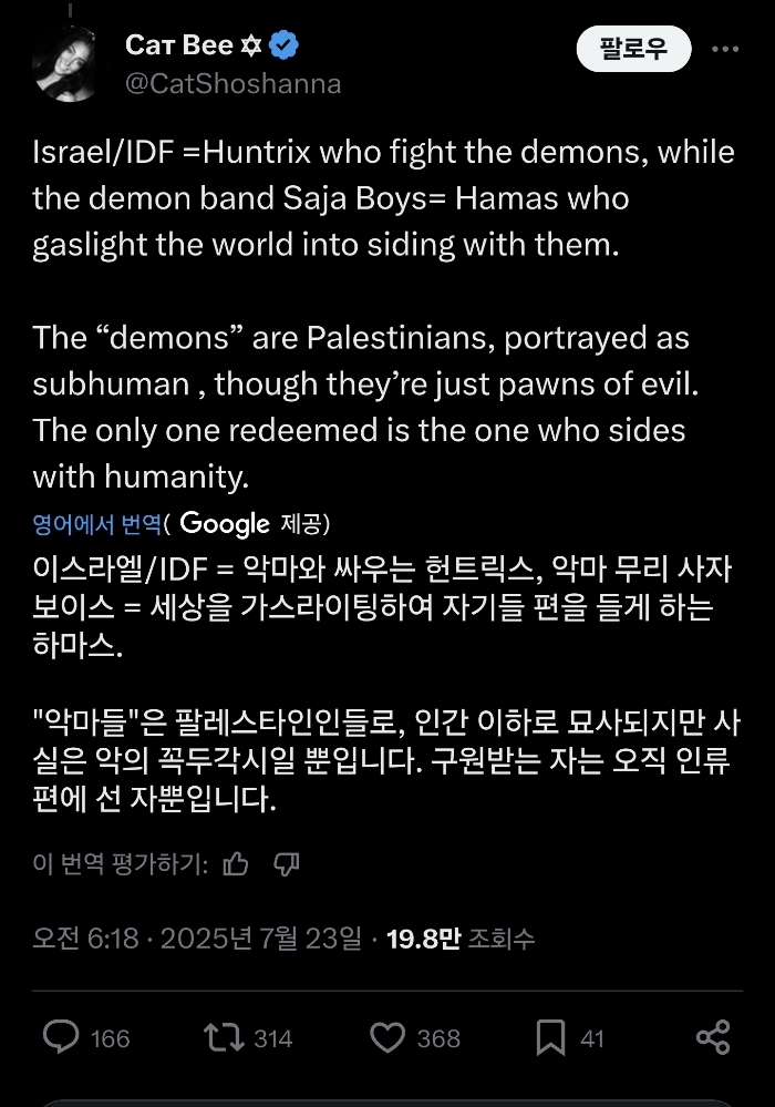 "팔레스타인 지지자들(Pro-Palestinians)이 넷플릭스 영화 ‘KPop Demon Hunters’를 보이콧하고 있다.