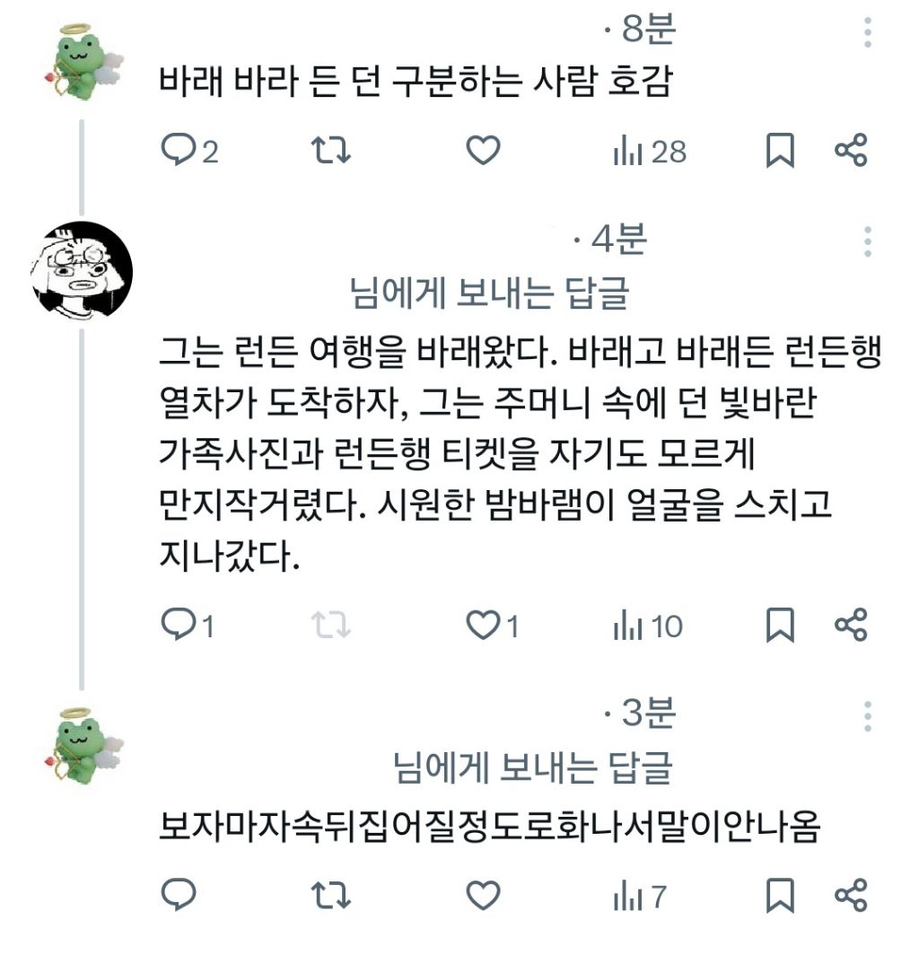 [스크랩] [흥미돋]바래 바라 든 던 구분하는 사람 호감 작성자여기사람살려|작성시간25.07.24|조회수9,928 목록 댓글 45 글자크기 작게가 글자크기 크게가 다음검색 스크랩 원문 : 쭉빵카페 현재 게시글 추가 기능 열기 북마크 공유하기 신고 센터로 신고 댓글 댓글 45 댓글쓰기 답글쓰기 댓글 리스트 작성자라면조지기 | 작성시간 25.07.24 아 ㅋㅋㅋㅋㅋㅋㅋㅋㅋㅋㅋㅋ 개터졌네 아 ㅋㅋㅋㅋㅋㅋㅋㅋㅋㅋㅋ 작성자토요일이싫쥬 | 작성시간 25.07.24 밤바램ㅋㅋㅋㅋㅋㅋㅋ 작성자여유로운굼뱅이 | 작성시간 25.07.24 ㅋㅋㅋㅋㅋㅋㅋㅋㅋㅋㅋ 작성자아시모프 | 작성시간 25.07.25 아좈나웃기네 작성자오늘도 누워있음 | 작성시간 25.07.25 런든 ㅋㅋㅋㅋㅋㅋㅋㅋㅋㅋㅋㅋㅋㅋㅋ 댓글 전체보기