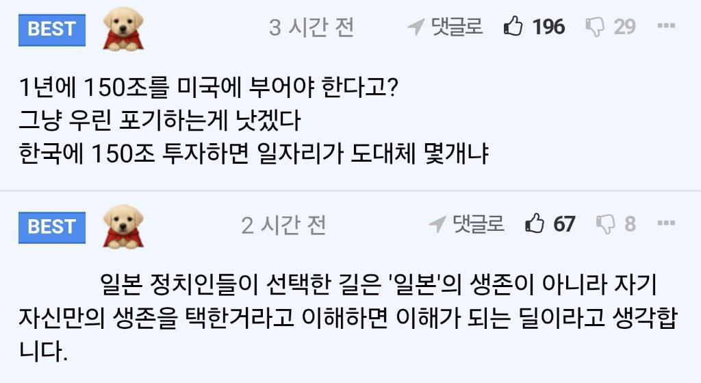 [기타]사실상 경제식민지 선언이라는 일본의 미국 5500억달러 투자 세부내역 작성자장븅태|작성시간25.07.25|조회수5,139 목록 댓글 54 글자크기 작게가 글자크기 크게가 출처: 여성시대 장븅태진주만공습 보상을 이제하는수준 ㄷㄷ문제는 다음은 우리차례라는거 다음검색 현재 게시글 추가 기능 열기 북마크 공유하기 신고 센터로 신고 댓글 댓글 54 댓글쓰기 답글쓰기 댓글 리스트 작성자쪼기사망 | 작성시간 25.07.25 윤이었음 진짜 우리나라 진즉 팔아먹었을듯 .. 작성자혼문 | 작성시간 25.07.25 걍 관세 내지... 작성자버터비어란 | 작성시간 25.07.25 일본은 스스로 나라 망조 확정이라고 인식하고 있나봄 작성자시작법 | 작성시간 25.07.25 다들 비슷한 생각이네 글 읽으면서 윤이었음 끔찍 작성자피트인 | 작성시간 25.07.25 미쳤 댓글 전체보기