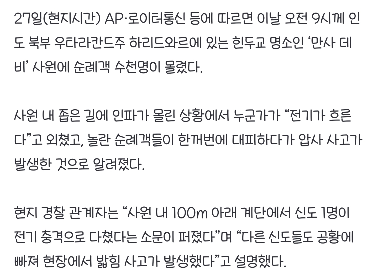 [여시뉴스데스크]“전기 흐른다” 인도 힌두 사원서 압사사고 최소 35명 사상자…원인이? 작성자너너뉘기야|작성시간25.07.27|조회수7,773 목록 댓글 1 글자크기 작게가 글자크기 크게가 출처: https://naver.me/5KqZyRo1“전기 흐른다” 인도 힌두 사원서 압사사고 최소 35명 사상자…원인이?만사 데비 사원에 대규모 군중 몰려 인도 북부의 유명 힌두교 사원에 많은 순례객이 한꺼번에 몰린 뒤 압사 사고가 발생해 최소 35명의 사상자가 발생했다. 27일(현지시간) AP·로이터통신 등에 따n.news.naver.com전문 링크 다음검색 현재 게시글 추가 기능 열기 북마크 공유하기 신고 센터로 신고 댓글 댓글 1 댓글쓰기 답글쓰기 댓글 리스트 작성자사랑해도혼나지않는꿈이였다 | 작성시간 25.07.27 헐 댓글 전체보기
