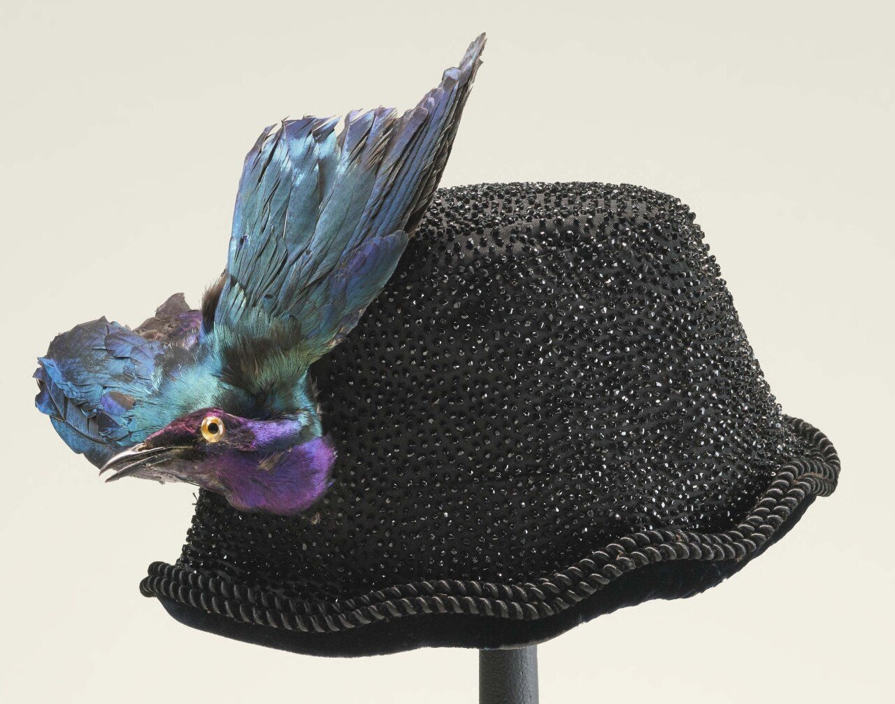 모자 위에 올려진 새는 생동감 있게 보여져야 했기 때문에 죽은 새의 눈에는 유리로 된 눈이 박혔다.