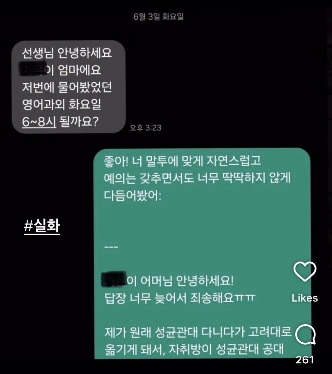 [흥미돋]과외 학생 학부모에게 실수로 보내버린 문자 작성자루카걸어다니노|작성시간25.07.30|조회수110,486 목록 댓글 45 글자크기 작게가 글자크기 크게가 출처: 여성시대 루카걸어다니노ㅋㅋㅋㅋㅋㅋㅋㅋㅋㅋㅋㅋㅋㅋㅋㅋㅋ 다음검색 현재 게시글 추가 기능 열기 북마크 공유하기 신고 센터로 신고 댓글 댓글 45 댓글쓰기 답글쓰기 댓글 리스트 작성자상온노출 | 작성시간 25.07.30 으악 ㅋㅋㅋㅋㅋ 작성자떼잉또잉 | 작성시간 25.08.01 요즘 이런 실수 하는 사람들 많음ㅎㅎㅎ 작성자모수부호 | 작성시간 25.08.04 어억 대박이다 지피티 였구나순간 이해못함 ㅠㅠ ㅋㅋㅋㅋㅋㅋㅋㅋㅋㅋㅋㅋㅋ 작성자丕刀卜乙卜人I凹卜乙卜口卜 | 작성시간 25.08.05 어른들은 저런거 이해못하시던데... 작성자안물어봤따요다야 | 작성시간 25.11.03 귀여운데 댓글 전체보기