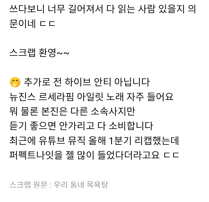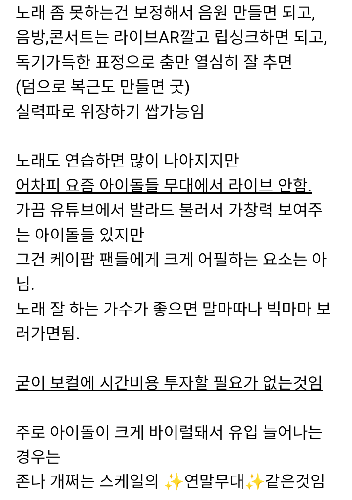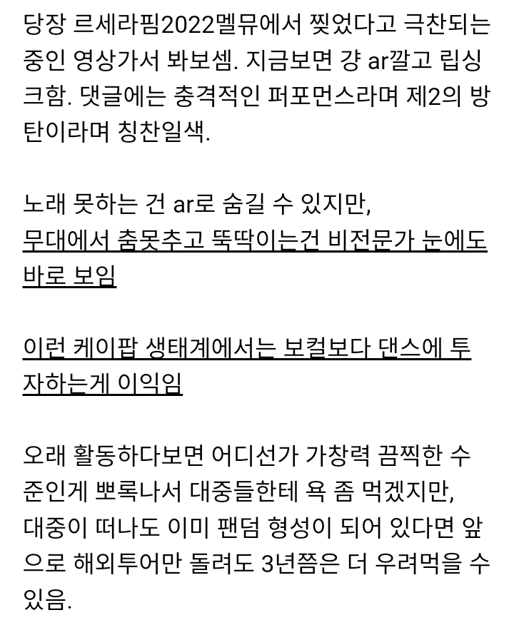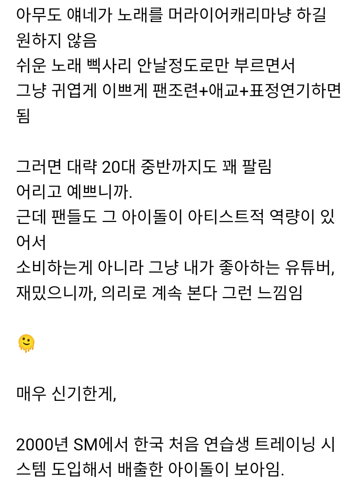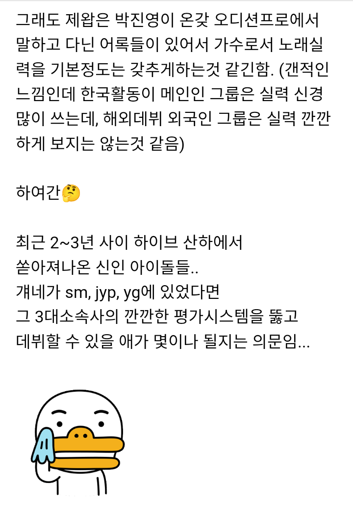 작성자dodnwhfbf 작성시간 25.08.02 하이브돌들 그래서 노래나 성격같은건 좋아도 매력이 없음.. 아이돌로서 딱 5년 7년정도 하면 더 볼게 없는느낌