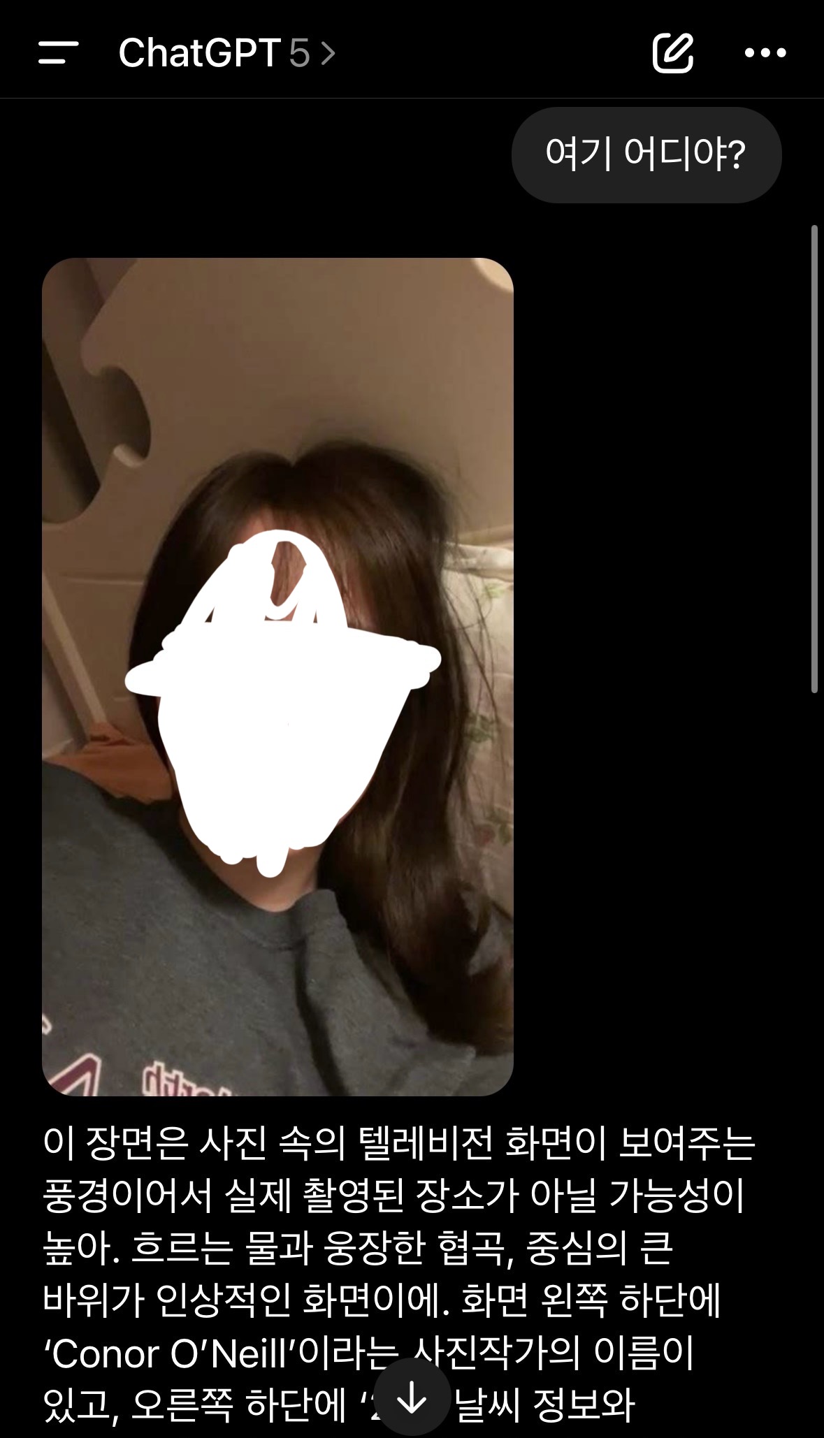 풍경사진 보내면서 위치가 어딘지 알려달라니까 갑자기 모르는 여자 셀카 보냄..... 혹시 몰라서 눈은 가렸는데 구글 이미지검색해도 안나와. 밤에 개놀랫네ㅠㅠㅠㅠㅠㅠ