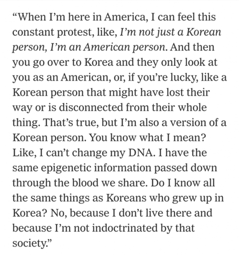 미국에 살 땐 내가 그냥 한국인이 아닌 미국인으로 느꼈다. 한국에 가면 나를 미국인으로만 바라보거나 길을 잃은 한국인으로 바라본다.