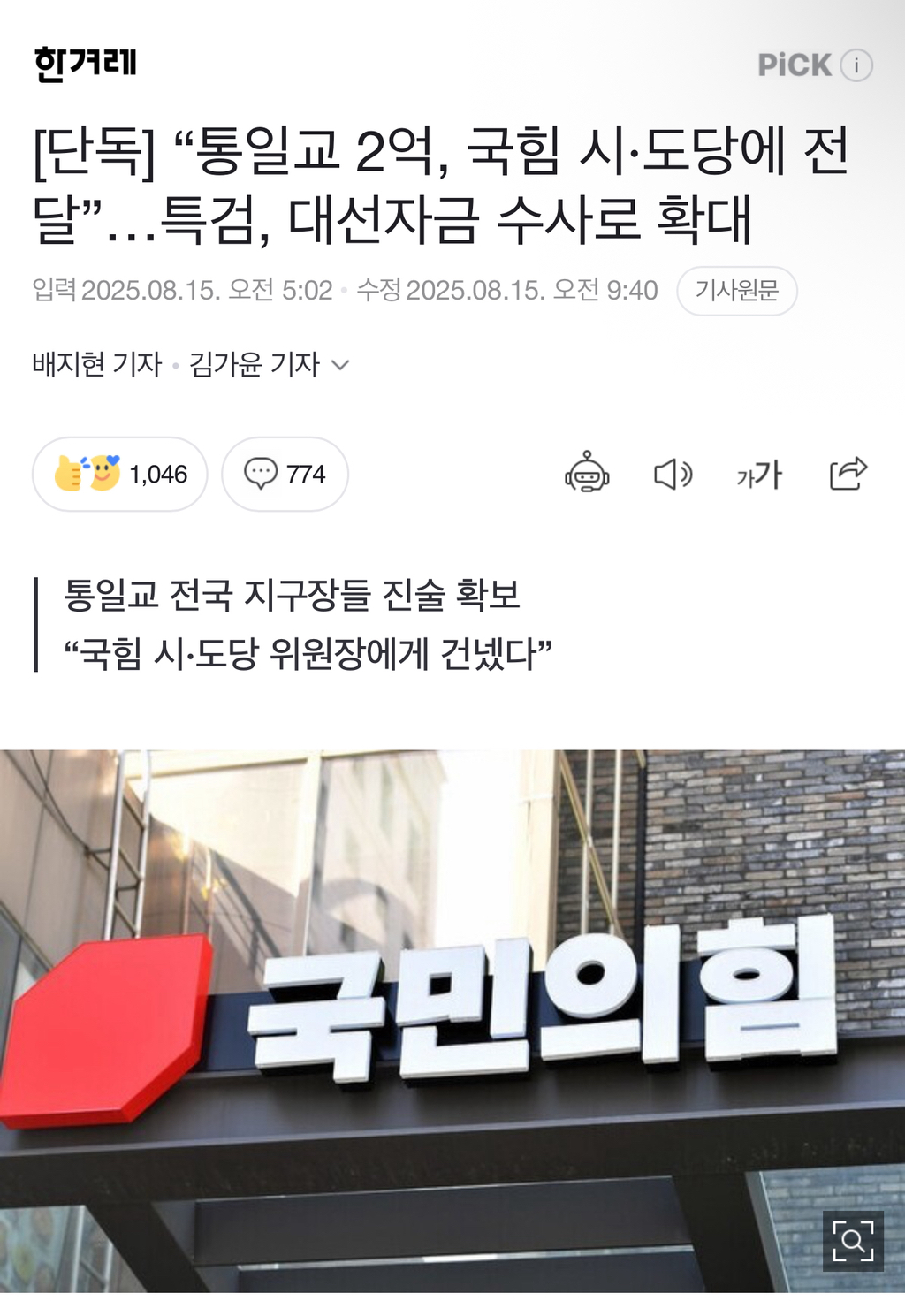 [여시뉴스데스크][단독] “통일교 2억, 국힘 시·도당에 전달”…특검, 대선자금 수사로 확대 작성자haiopqsrcs|작성시간25.08.15|조회수1,176 목록 댓글 22 글자크기 작게가 글자크기 크게가 출처: https://n.news.naver.com/article/028/0002761312[단독] “통일교 2억, 국힘 시·도당에 전달”…특검, 대선자금 수사로 확대‘통일교 청탁 의혹’을 수사 중인 민중기 특별검사팀이 2022년 대선을 앞두고 통일교 자금 2억여원이 국민의힘 시도당으로 흘러간 정황을 포착한 것으로 확인됐다. 통일교 고위 간부가 권성동 n.news.naver.com통일교 댓글부대도 꼭 파헤쳐 주길 다음검색 현재 게시글 추가 기능 열기 북마크 공유하기 신고 센터로 신고 댓글 댓글 22 댓글쓰기 답글쓰기 댓글 리스트 작성자회갈색고양이 | 작성시간 25.08.15 가자!!!!!!!! 다 파헤쳐!! 작성자리얼릴리티 | 작성시간 25.08.15 국힘당해산 곧이다 🩵 작성자암던하이딩 | 작성시간 25.08.15 이야 미쳤네 얘네 진짜네 진짜 작성자스윗허엄 | 작성시간 25.08.15 미쳤다 .. 작성자정신놔간선비 | 작성시간 25.08.15 해산해 돈 다물어내 애초에 부정선거는 윤석열이 했으면서 댓글 전체보기