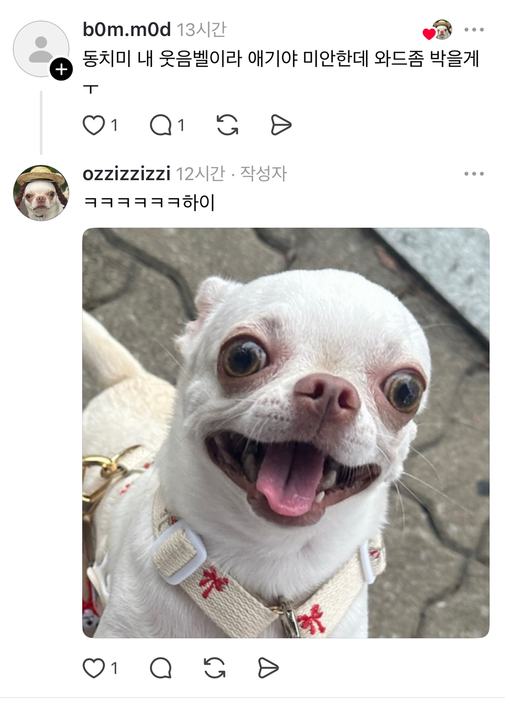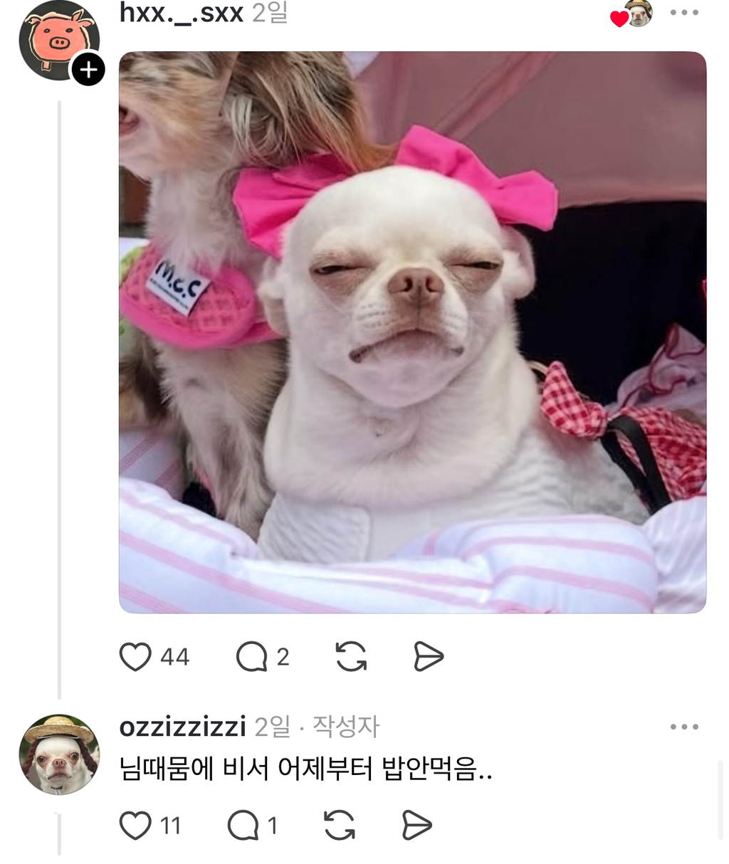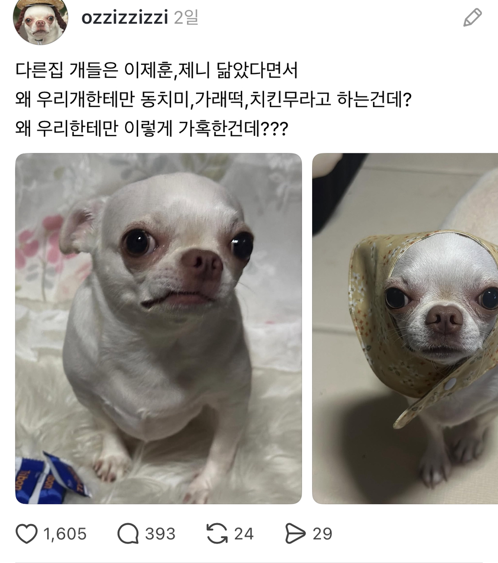 [흥미돋]왜 우리개한테만 동치미, 가래떡, 치킨무라고 하는건데? 작성자hufufu|작성시간25.08.20|조회수52,358 목록 댓글 41 글자크기 작게가 글자크기 크게가 https://www.threads.com/@ozzizzizzi/post/DNesLBDpssP강아지유치원에 도시락 잘못싸갔던 튀김이 남매https://m.cafe.daum.net/subdued20club/ReHf/5395158?svc=cafeapp우리 강아지 유치원 도시락 잘못가져갔어..출처: https://www.threads.com/@ozzizzizzi/post/DMovz5PJDWFm.cafe.daum.net 다음검색 현재 게시글 추가 기능 열기 북마크 공유하기 신고 센터로 신고 댓글 댓글 41 댓글쓰기 답글쓰기 댓글 리스트 작성자수화기를 쾅쾅 | 작성시간 25.08.20 아만다 사이프리드 존나욱기네 작성자illusomina | 작성시간 25.08.20 동치미잖아 작성자박경원쌤 | 작성시간 25.08.20 동룡이 작성자눕는 건 잘 때만 하는 것 | 작성시간 25.08.20 이동휘 닮았음 ㅋㅋㅋㅋ 작성자으아아아아아자자ㅏ자ㅏ | 작성시간 25.08.20 아 맨밑에 링크 오이개웃기네 댓글 전체보기