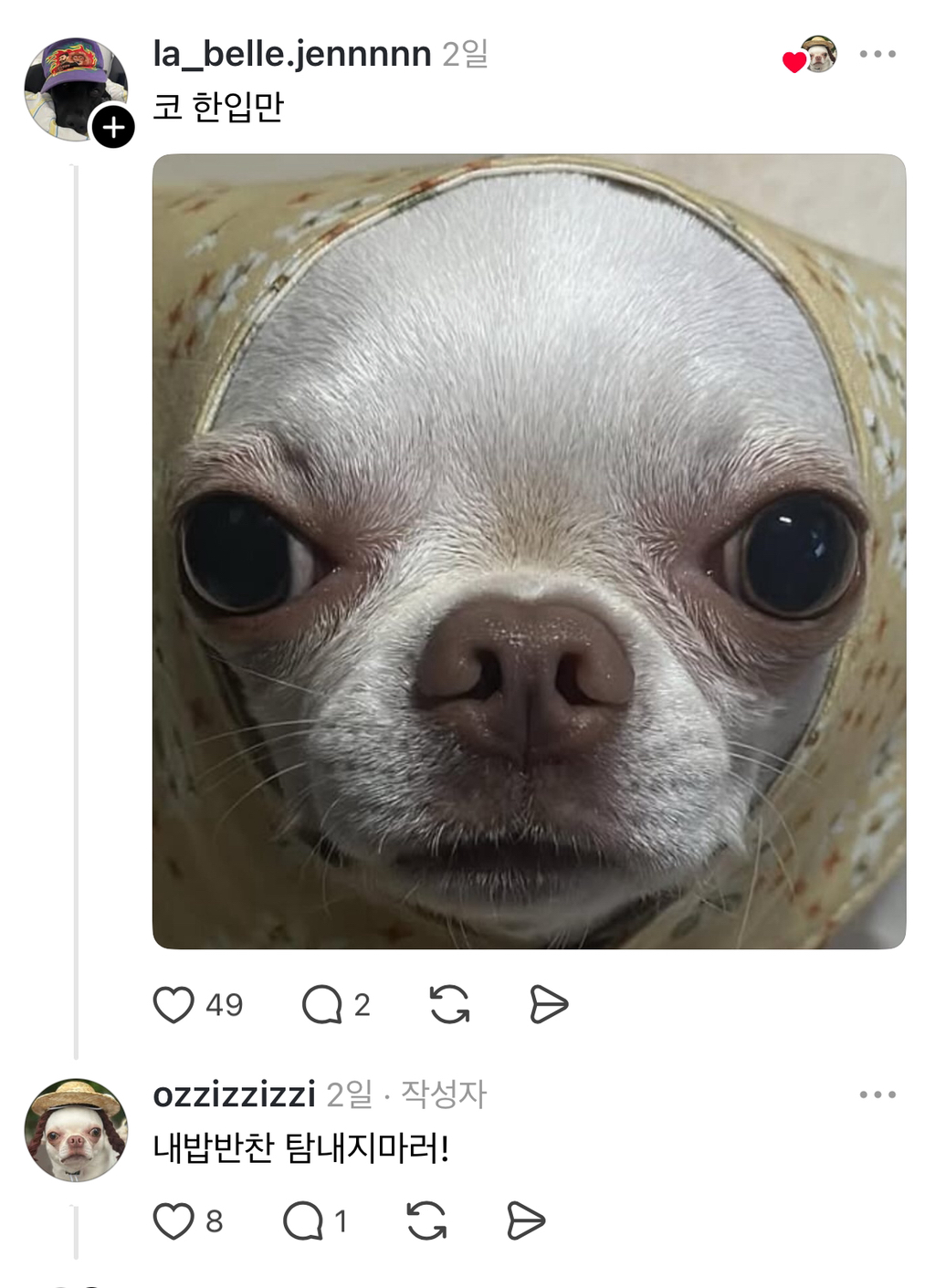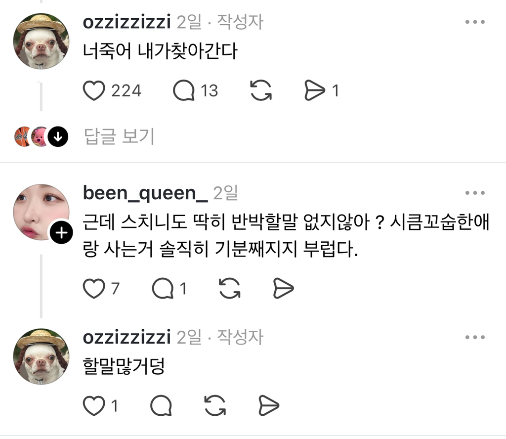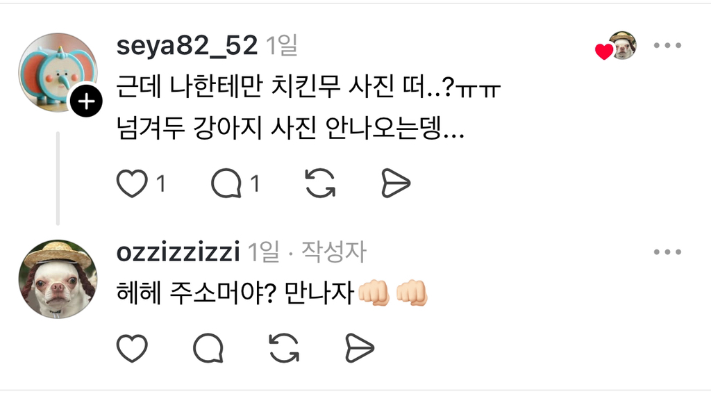 [흥미돋]왜 우리개한테만 동치미, 가래떡, 치킨무라고 하는건데? 작성자hufufu|작성시간25.08.20|조회수52,358 목록 댓글 41 글자크기 작게가 글자크기 크게가 https://www.threads.com/@ozzizzizzi/post/DNesLBDpssP강아지유치원에 도시락 잘못싸갔던 튀김이 남매https://m.cafe.daum.net/subdued20club/ReHf/5395158?svc=cafeapp우리 강아지 유치원 도시락 잘못가져갔어..출처: https://www.threads.com/@ozzizzizzi/post/DMovz5PJDWFm.cafe.daum.net 다음검색 현재 게시글 추가 기능 열기 북마크 공유하기 신고 센터로 신고 댓글 댓글 41 댓글쓰기 답글쓰기 댓글 리스트 작성자수화기를 쾅쾅 | 작성시간 25.08.20 아만다 사이프리드 존나욱기네 작성자illusomina | 작성시간 25.08.20 동치미잖아 작성자박경원쌤 | 작성시간 25.08.20 동룡이 작성자눕는 건 잘 때만 하는 것 | 작성시간 25.08.20 이동휘 닮았음 ㅋㅋㅋㅋ 작성자으아아아아아자자ㅏ자ㅏ | 작성시간 25.08.20 아 맨밑에 링크 오이개웃기네 댓글 전체보기
