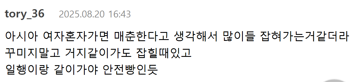 작성시간 26.01.31 꾸꾸꾸 안해도 여자혼자가면 걸려 거지꼴로 들어갓는데도 걸림