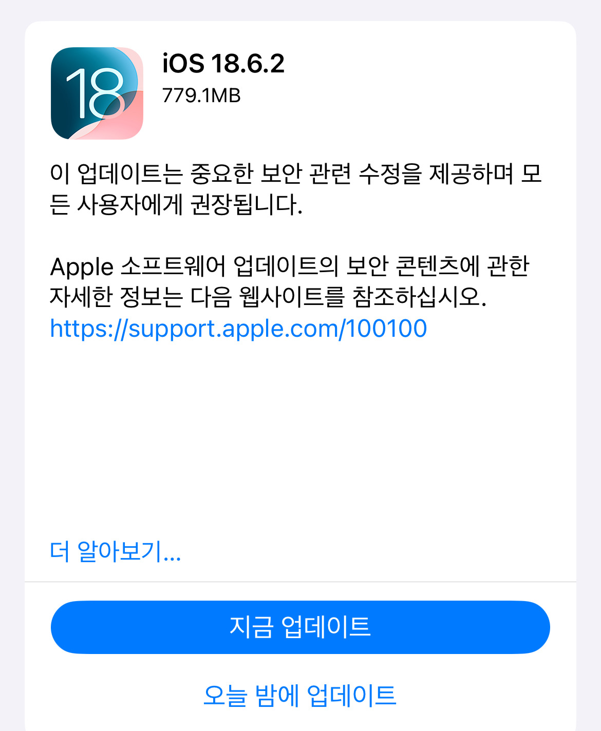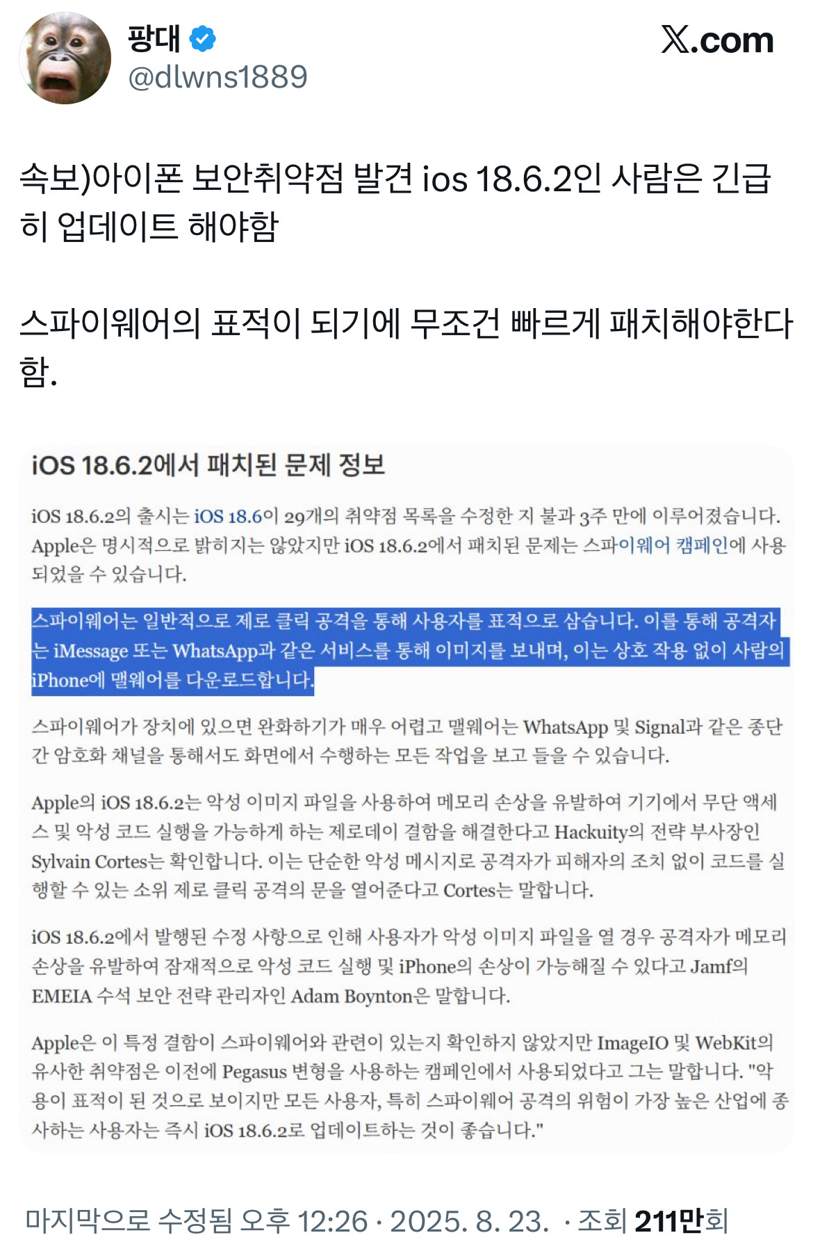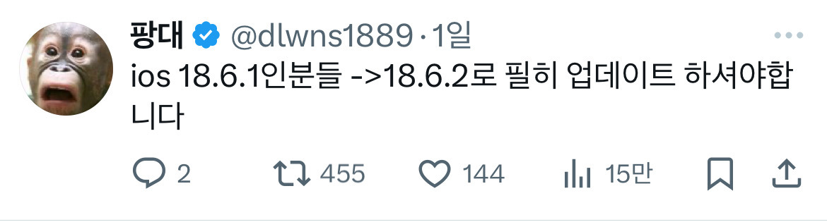 *여성시대* 차분한 20대들의 알흠다운 공간 [흥미돋]아이폰 보안취약점 발견 ios 18.6.2 긴급 업데이트 작성시간25.08.24|조회수71,041 목록 댓글 158 글자크기 작게가 글자크기 크게가 출처: https://x.com/dlwns1889/status/1959094825439117614?s=46*18.6.1인 사람은얼른 합시다ㅏㅏ 다음검색 현재 게시글 추가 기능 열기 북마크 공유하기 신고 센터로 신고 댓글 158 댓글 리스트 작성시간 25.08.25 으악 12미니 죽는다 작성시간 25.08.25 아 존나 귀찮게 해 진짜 애플 ㅅ 뷰 작성시간 25.08.25 16.7.11에서 지원을 멈춤ㅋㅋㅋㅋ 작성시간 25.08.25 16.3.1인데 언제 이렇게 업데이트가 됐었디야 작성시간 25.08.25 17.0.2 인데 업뎃 꼭 해야하나🤔 카페 방문해 더 많은 댓글 만나기!