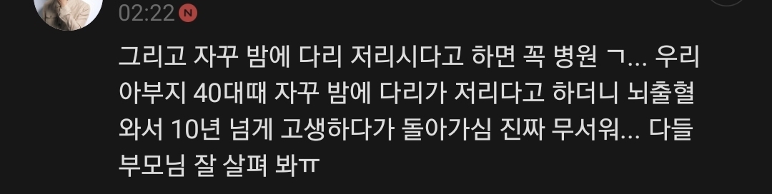 작성시간 25.08.26 울 엄마..내가 알아차리지못하고 하루를 버리고 눈동자가 몰리고 입이 돌아가서야 응급차 부른거 정말 죽을때까지 죄책감에 시달려 살거같아..