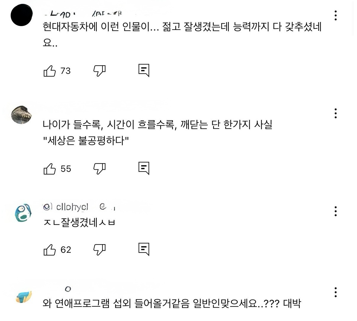 [흥미돋]얼굴로 유명해진 01년생 현대차 신입 남직원 작성자마이퓨|작성시간25.08.29|조회수89,478 목록 댓글 404 글자크기 작게가 글자크기 크게가 출처: 여성시대 마이퓨https://youtu.be/c4bOwxJIIhE?si=COGgGARTebp1PYPi 다음검색 현재 게시글 추가 기능 열기 북마크 공유하기 신고 센터로 신고 댓글 댓글 404 댓글쓰기 답글쓰기 댓글 리스트 작성자똔똔똔이 | 작성시간 25.08.29 부럽노 작성자민트페퍼 | 작성시간 25.08.29 그냥 01인데 현차 간 게 부럽다 작성자내 꿈은 돈 많은 백수 | 작성시간 25.09.02 ㄷㄷ.. 작성자포푸링 | 작성시간 25.09.05 우영우에 나온 남자 닮앗다 작성자INTP 인간 | 작성시간 25.09.07 약간 민호 닮았다 댓글 전체보기