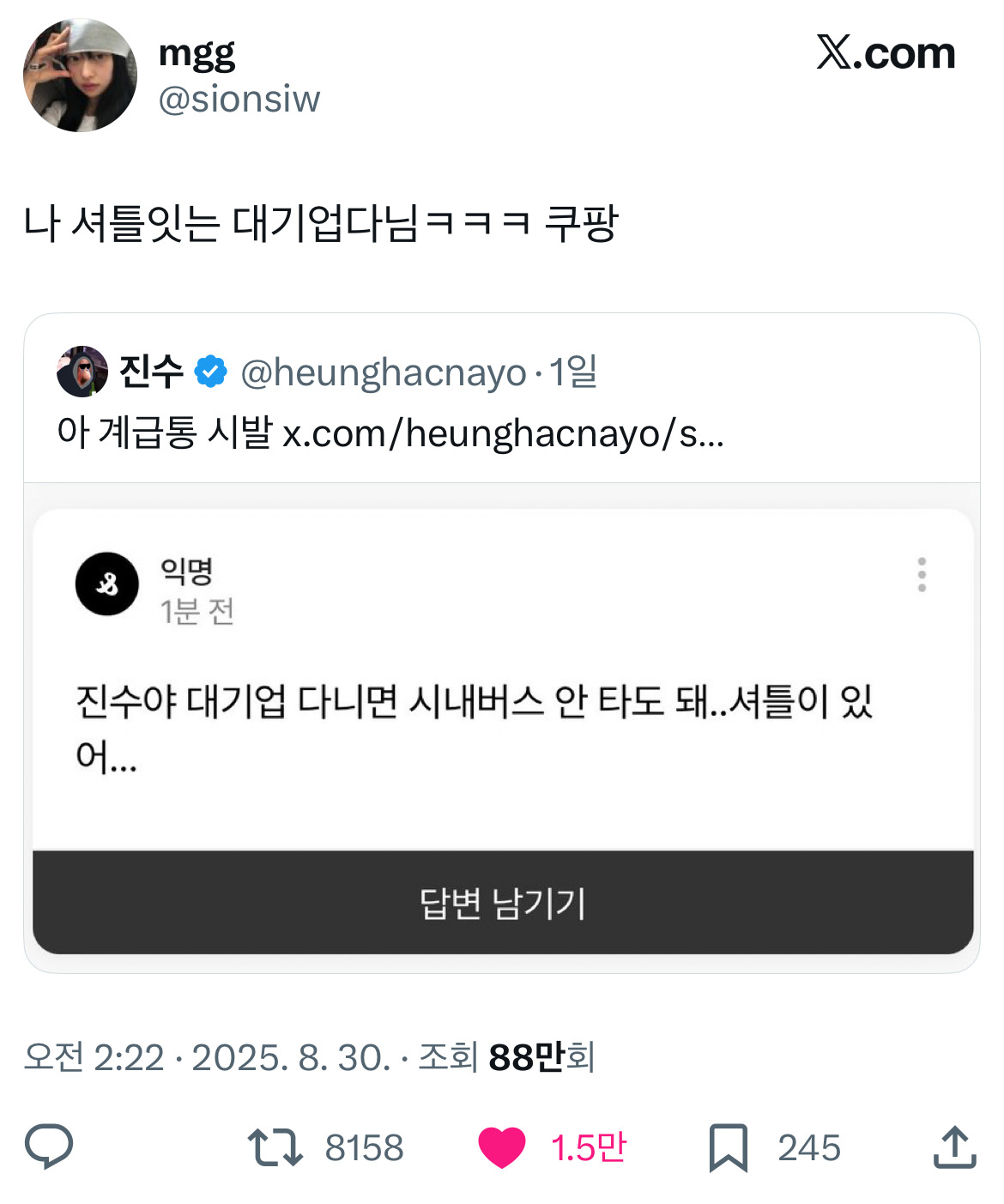 작성시간 25.08.31 ㄹㅇ 집앞에 하이닉스 셔틀 오더라 6시 반에...