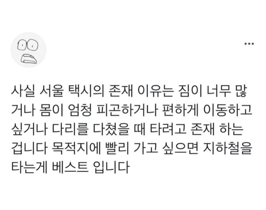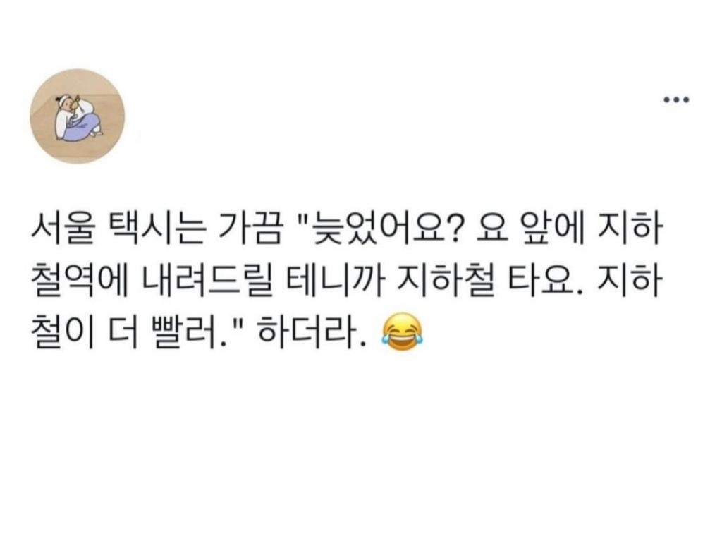 작성자아사이볼 작성시간 25.09.01 서울 웬만한 도로 50키로제한이라 달리지도못해 그리고 물리적으로 차가 조오온나 많아서 더 오래걸림 지하철이 제일 빠른데 지옥철인데다가 환승 등 개귀찮으니까 택시타는거징 ㅜ