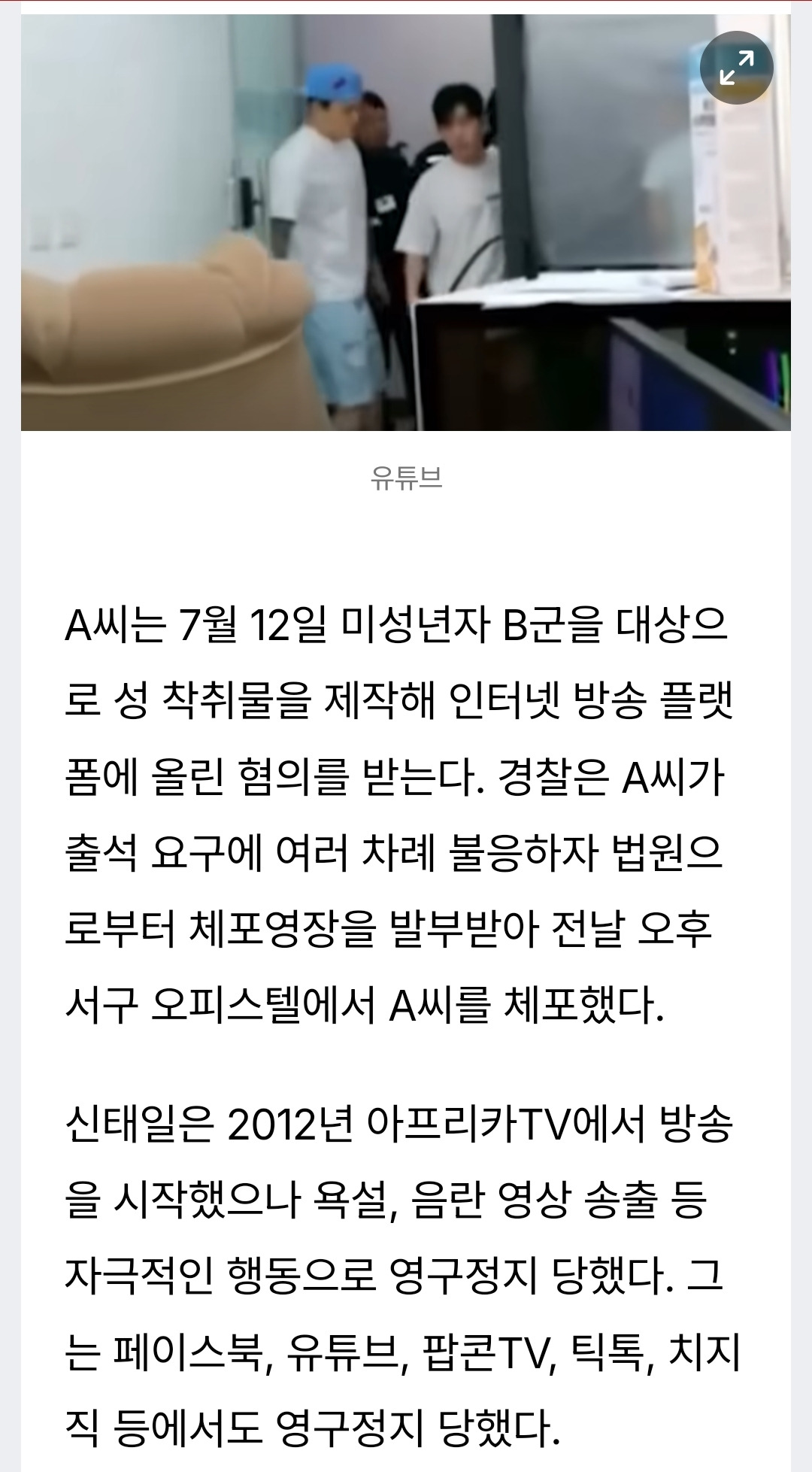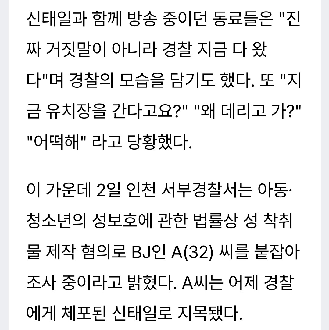 [여시뉴스데스크]BJ신태일, 생방송서 경찰에 긴급체포 당했다…영상 보니 작성자Sunmoonstar02|작성시간25.09.02|조회수17,715 목록 댓글 27 글자크기 작게가 글자크기 크게가 출처: https://www.topstarnews.net/news/articleView.html?idxno=15790866BJ신태일, 생방송서 경찰에 긴급체포 당했다…영상 보니 BJ 신태일에 대해 관심이 쏠리고 있다.신태일은 지난 1일 방송 도중 경찰에 긴급체포됐다.당시 영상에 따르면 신태일은 동료들과 방송을 진행했다. 이때 경찰이 방문했고, 신태일은 "체포영장?"www.topstarnews.net 다음검색 현재 게시글 추가 기능 열기 북마크 공유하기 신고 센터로 신고 댓글 댓글 27 댓글쓰기 답글쓰기 댓글 리스트 작성자혼돈의카오스냥 | 작성시간 25.09.02 사회에 내보내니까 자꾸 체포해야되잖아 그냥 가둬놔 작성자미친거아냐 | 작성시간 25.09.02 헐..미자 성착취물.... 작성자쿤댕꾸어이짭유안 | 작성시간 25.09.02 이거 진짜 기괴해저 미성년자 남자애라고 나오잖아?민짜 트젠임;; 답댓글 작성자28991 | 작성시간 25.09.02 엥..? 작성자허쉬 | 작성시간 25.09.03 저 미자 트젠이더라 댓글 전체보기