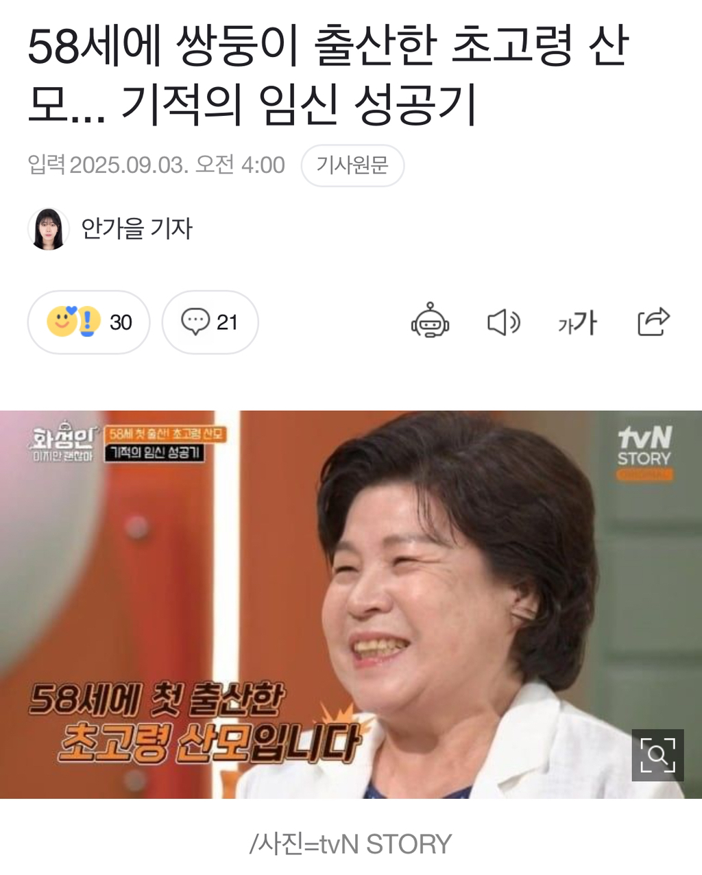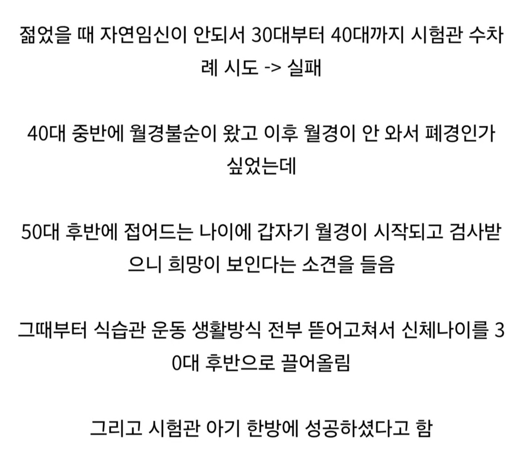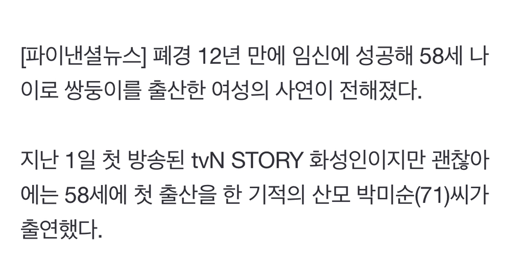 *여성시대* 차분한 20대들의 알흠다운 공간 [여시뉴스데스크]58세에 쌍둥이 출산한 초고령 산모... 기적의 임신 성공기 작성시간25.09.03|조회수55,740 목록 댓글 211 글자크기 작게가 글자크기 크게가 출처: https://n.news.naver.com/article/014/0005400639?sid=10258세에 쌍둥이 출산한 초고령 산모... 기적의 임신 성공기폐경 12년 만에 임신에 성공해 58세 나이로 쌍둥이를 출산한 여성의 사연이 전해졌다. 지난 1일 첫 방송된 tvN STORY 화성인이지만 괜찮아에는 58세에 첫 출산을 한 기적의 산모 박미순(71)씨가 출연n.news.naver.com 다음검색 현재 게시글 추가 기능 열기 북마크 공유하기 신고 센터로 신고 댓글 211 댓글 리스트 작성시간 25.09.05 와.... 진짜 대단하다 58세에 작성시간 25.09.05 생리 다시 시작한 거 진짜 대박이다 몸관리 어떻게 하셨길래 작성시간 25.09.06 와미쳤다대박이다 뭘해도 성공하실분 작성시간 25.09.06 와 신체나이 30대로 어케하심 작성시간 25.09.16 오래오래 건강하게 사세요! 카페 방문해 더 많은 댓글 만나기!