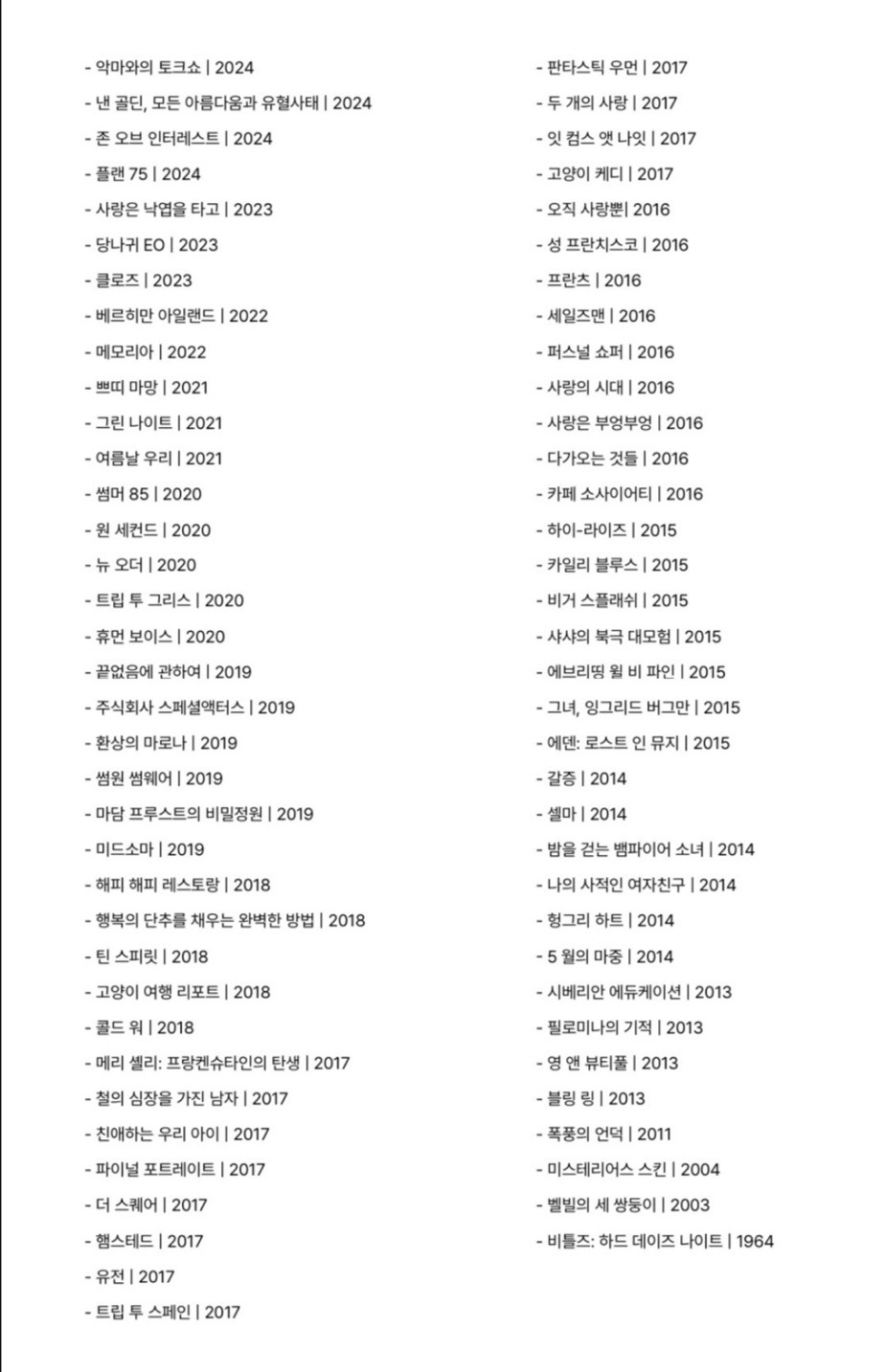 [흥미돋]명작들만 가져오는 걸로 유명한 소지섭이 수입한 영화들 작성자냐웅잉|작성시간25.09.04|조회수9,311 목록 댓글 22 글자크기 작게가 글자크기 크게가 출처: 여성시대 냐웅잉존 오브 인터레스트 (2023)서브스턴스 (2024)미드소마 (2019)화이트 버드(2023)마담 프루스트의 비밀정원 (2013)쁘띠 마망 (2021)오직 사랑하는 이들만이 살아남는다(2013)악마와의 토크쇼 (2024)오직 사랑뿐 (2018)두 개의 사랑 (2017)유전 (2018)선구안 뭐야 다음검색 현재 게시글 추가 기능 열기 북마크 공유하기 신고 센터로 신고 댓글 댓글 22 댓글쓰기 답글쓰기 댓글 리스트 작성자심봉사도로케 | 작성시간 25.09.04 어후 고마워요 소간지 작성자TADC | 작성시간 25.09.05 진짜 부러워 나도 돈 많이 벌면 개쩌는 영화 들여오고싶다 작성자파란아보카도 | 작성시간 25.09.05 소지섭이 수입해서 우리가 볼 수 잇는거야??? 작성자바질마스카포네 | 작성시간 26.01.18 와 감다살 작성자첫눈오는날 | 작성시간 26.03.09 우오ㅓ... 댓글 전체보기