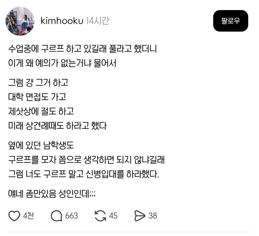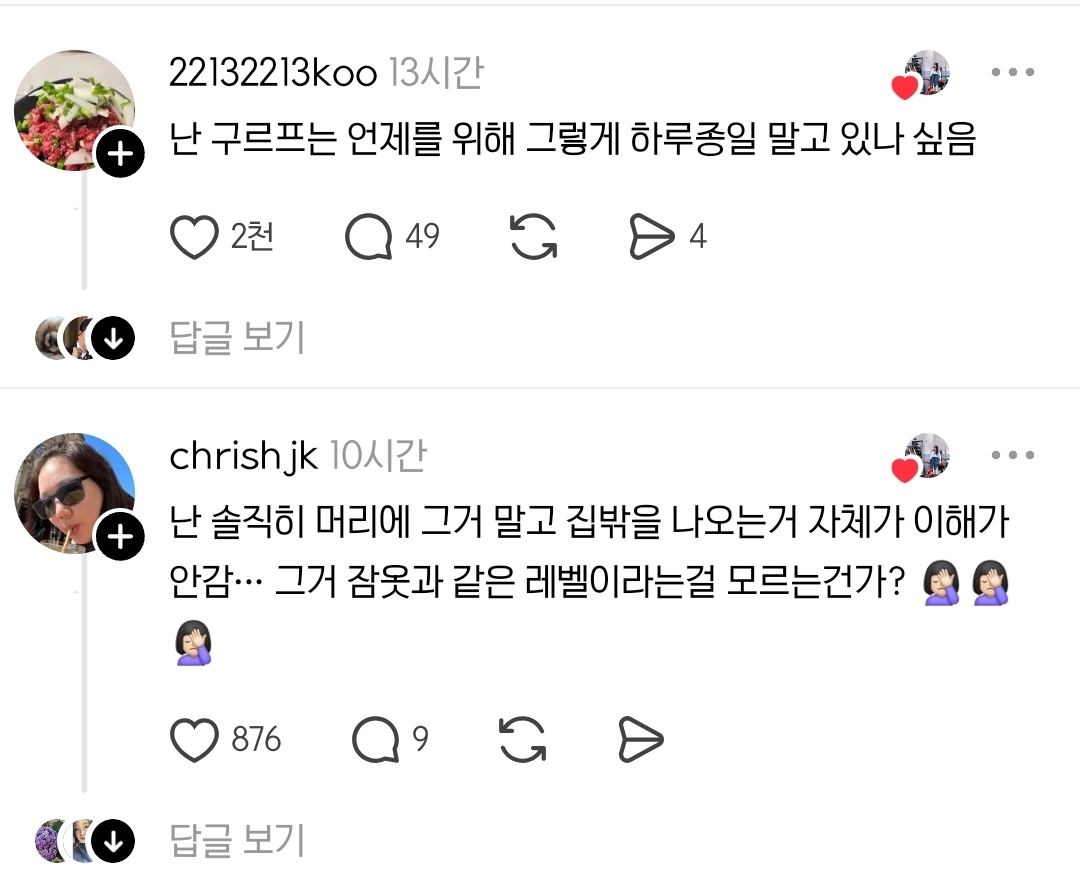 작성시간 25.09.07 진짜 개먼상관인가 싶음 남 어떻게 하고 다니는지 쳐다보고 평가하는 사람이 더 무서움 어련히 본인이 중요한 시간을 위해서 말겠지 ㅋㅋ
