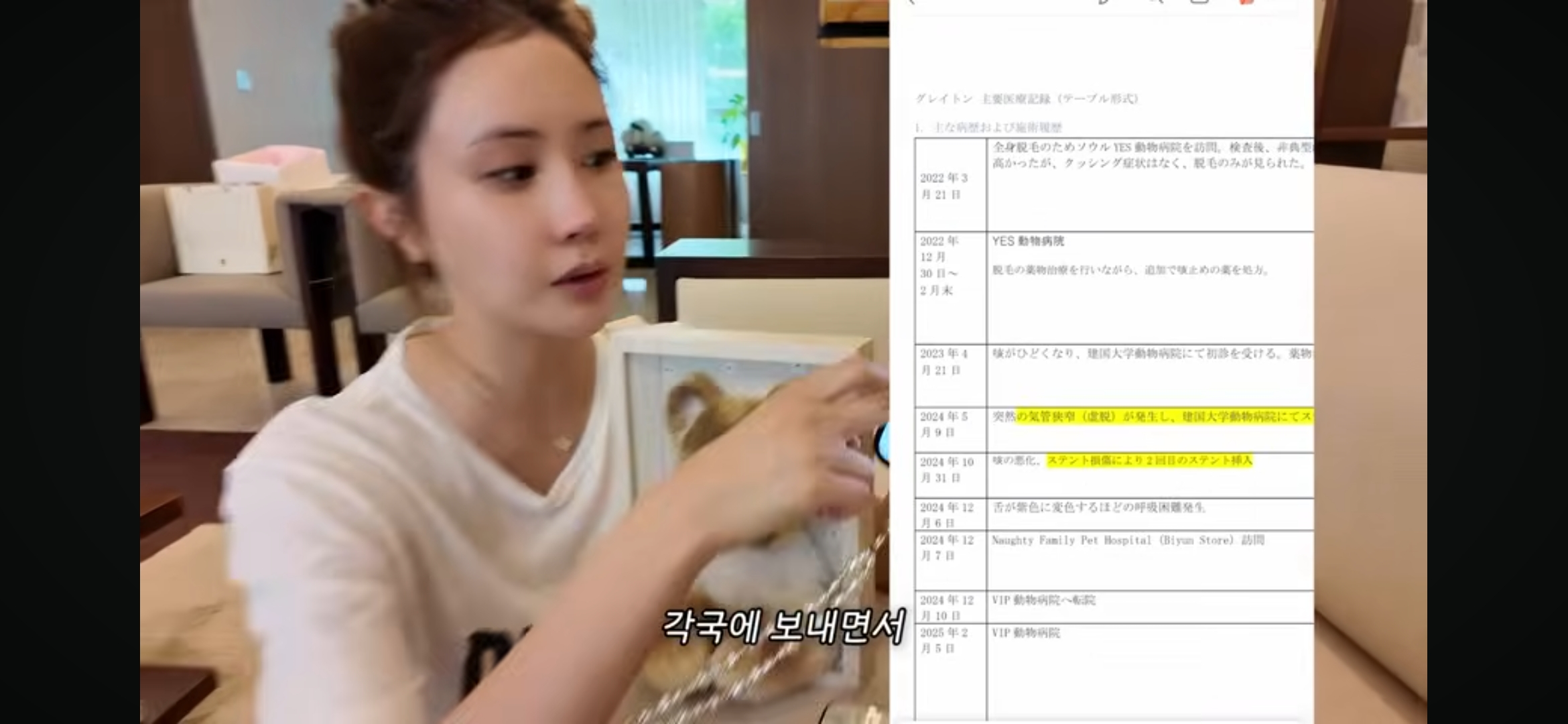 그레이튼은 2024년 5월, 기관지 협착증으로 서울의 한 대학동물병원에서 스텐트 시술을 받았습니다. 하지만 분지부에 너무 가깝게 삽입되어 기침이 심해졌습니다. 시술 병원은 끝내 인정하지 않았지만, 여러 다른 병원에서는 그것이 원인이라고 말씀해주셨습니다.
