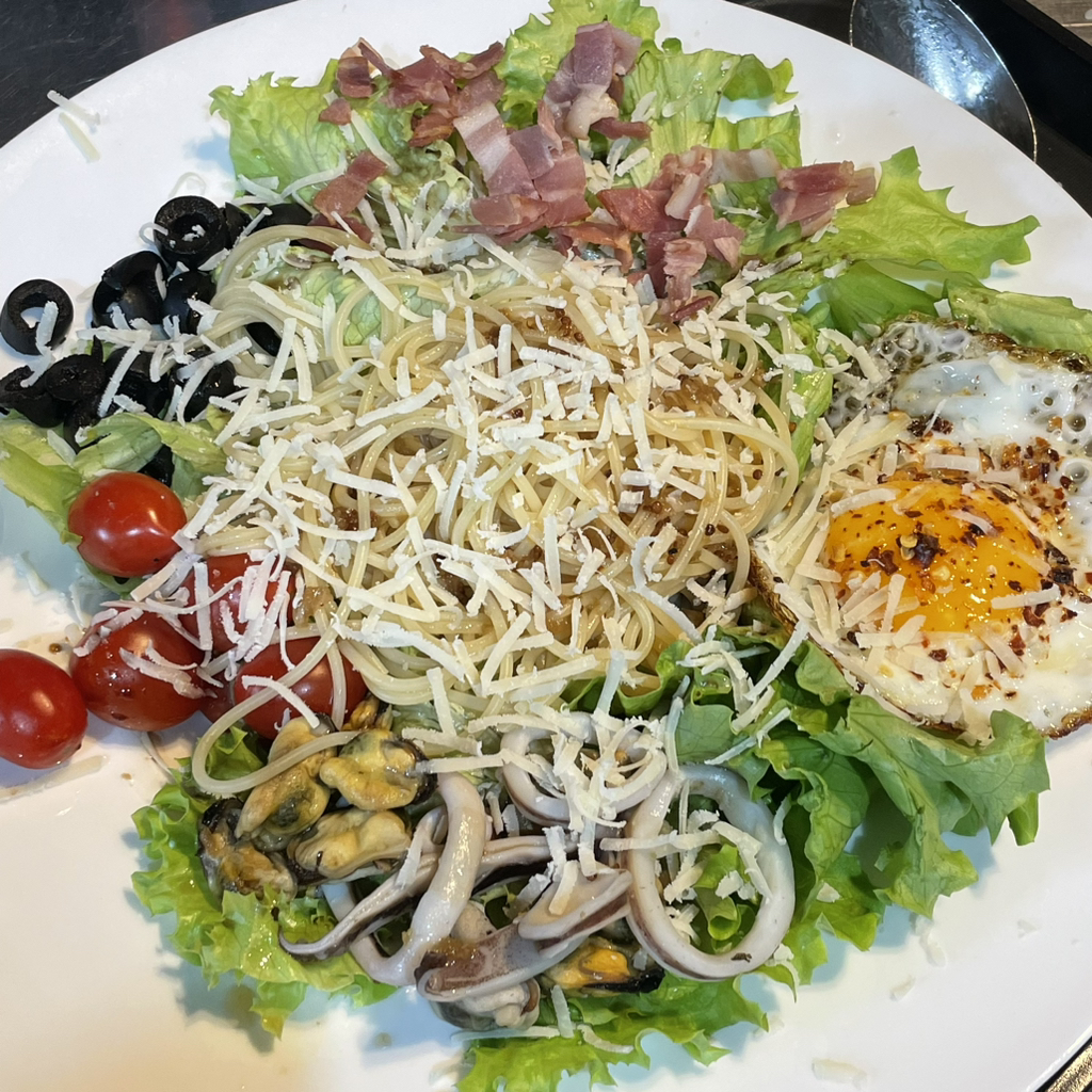 블랙올리브+방토+냉동해놓은 오징어+베이컨+단백질보충용 계란후라이(위에 크러쉬드페퍼)+그라나파다노 갈아올림