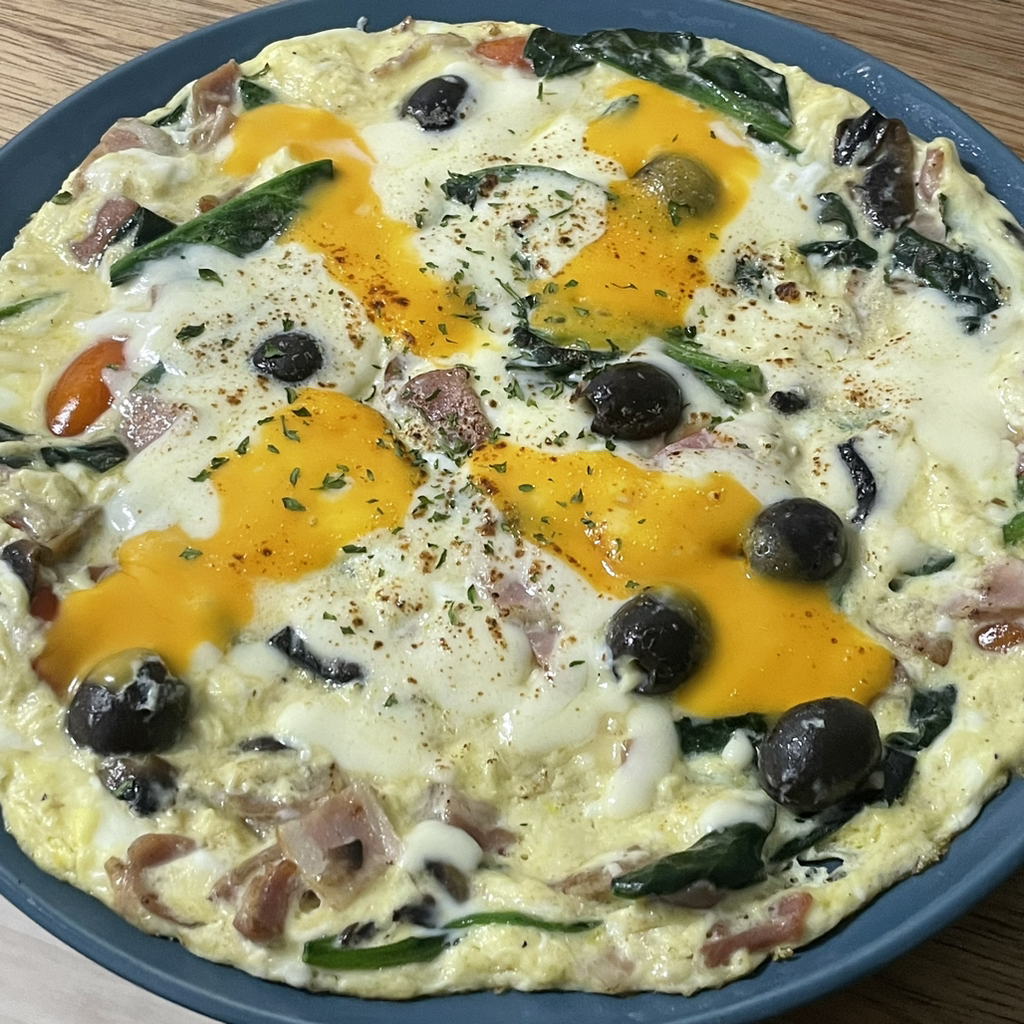 집에 시금치 있는걸로 뭐할까 하다가 냉장고에 있던 베이컨 장토 올리브 볶다가 계란에 우유넣고 치즈올려서 마무리