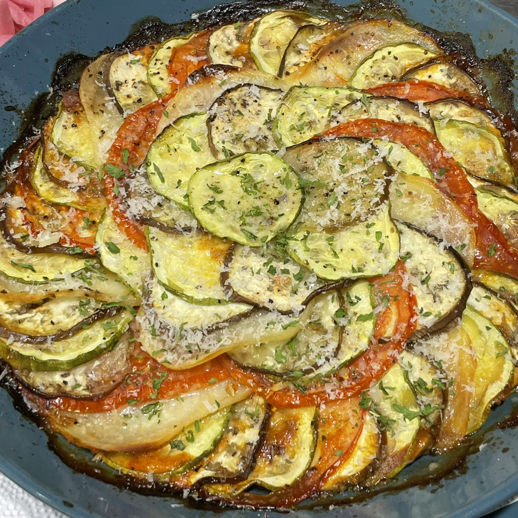 아래 토마토소스 깔고 가지+애호박+감자+토마토 둘어서 오븐에 구움