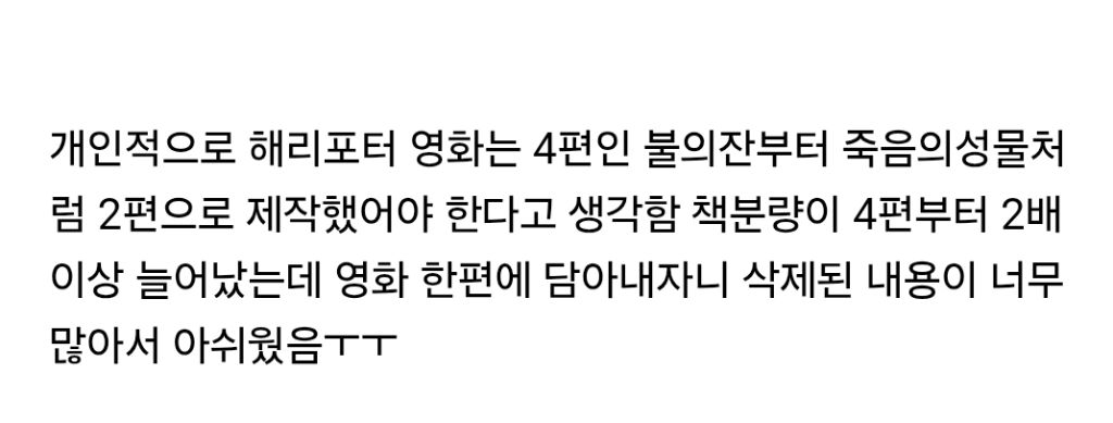 *여성시대* 차분한 20대들의 알흠다운 공간 [흥미돋]해리포터 영화에는 안 나와서 아쉬웠던 책 내용은? 작성시간25.09.08|조회수6,263 목록 댓글 27 글자크기 작게가 글자크기 크게가 출처: 여성시대 주미사미 다음검색 현재 게시글 추가 기능 열기 북마크 공유하기 신고 센터로 신고 댓글 27 댓글 리스트 작성시간 25.09.08 불의잔부터 영화 2편 했어야됨... 작성시간 25.09.08 해리는 무죄라네 작성시간 25.09.08 모든 삭제된 장면 작성시간 25.09.08 불의잔 퀴디치 월드컵도 거의 맛보기로만 나오고 ㅠㅠ 개허접힘 그때부터 영화정떨어짐 작성시간 25.09.08 SPEW 토하다(아님) 활동 카페 방문해 더 많은 댓글 만나기!