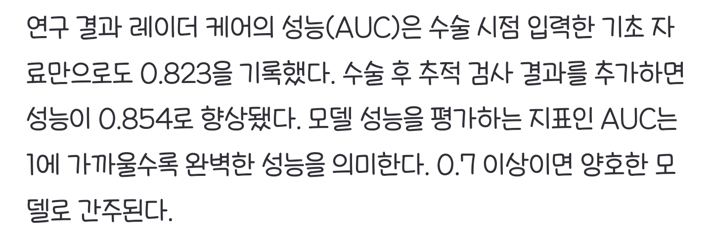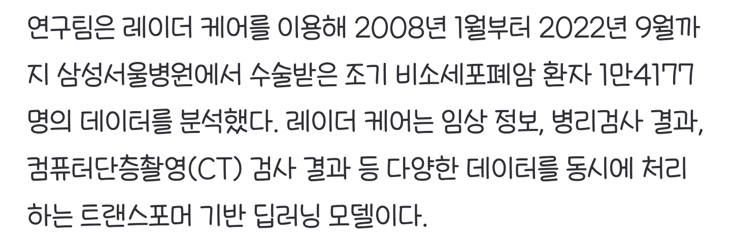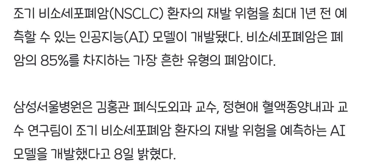 *여성시대* 차분한 20대들의 알흠다운 공간 [여시뉴스데스크]조기 폐암 재발 가능성, AI로 1년 전 예측 작성시간25.09.08|조회수5,251 목록 댓글 3 글자크기 작게가 글자크기 크게가 출처: https://naver.me/5yWhSCxO조기 폐암 재발 가능성, AI로 1년 전 예측조기 비소세포폐암(NSCLC) 환자의 재발 위험을 최대 1년 전 예측할 수 있는 인공지능(AI) 모델이 개발됐다. 비소세포폐암은 폐암의 85%를 차지하는 가장 흔한 유형의 폐암이다. 삼성서울병원은 김홍n.news.naver.com• • •• • • 다음검색 현재 게시글 추가 기능 열기 북마크 공유하기 신고 센터로 신고 댓글 3 댓글 리스트 작성시간 25.09.08 우리 아빠도 이거 있었으면 괜찮았을까 아무튼 잘 돼서 폐암 생존율 늘었으면 좋겠다 제발 작성시간 25.09.08 우와 몇 년전에 친구가 이거였나 암튼 잠깐 ai모델 만든다고 했던거 같은데.. 작성시간 25.09.08 빨리 상용화해줘요 ㅡㅡ 카페 방문해 더 많은 댓글 만나기!