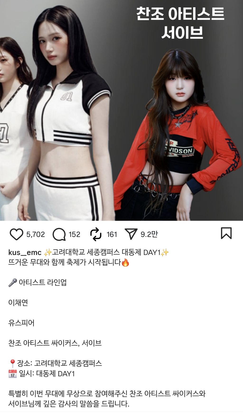 [흥미돋]축제에 찬조 아티스트로 서이브 부른 대학교 작성자굴티김|작성시간25.09.09|조회수34,176 목록 댓글 11 글자크기 작게가 글자크기 크게가 출처: 여성시대 굴티김는 고려대학교 세종캠찬조아티스트면 서이브측에서 나가고 싶다고 한건지 ㅋㅋㅋㅋㅋㅋㅋㅋㅋ 초중학교도 아니고 대학축제에 서이브라 신기함 다음검색 현재 게시글 추가 기능 열기 북마크 공유하기 신고 센터로 신고 댓글 댓글 11 댓글쓰기 답글쓰기 댓글 리스트 작성자월화술먹굼토웩 | 작성시간 25.09.09 난 귀여운데 얘 악플이 넘 많아 ㅠㅠ 비슷한 나잇대 애들의 질투 같긴 한데 굉장히 어리던데 참 안쓰러.. 작성자고레밥 | 작성시간 25.09.09 탕후루는 못참지;; 작성자김영철 | 작성시간 25.09.09 ㄱㅇㅇ.. 작성자엽닭에우동사리 | 작성시간 25.09.09 같은 세종출신이라 부른건가ㅋㅋㅋㅋ 작성자무릎이아프다 | 작성시간 25.09.09 탕탕후루후루 댓글 전체보기