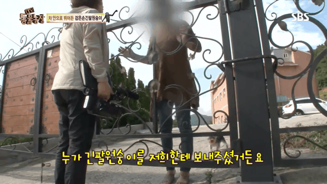 문이 열리자 허겁지겁 달려들어 어머님께 안기는 깜보