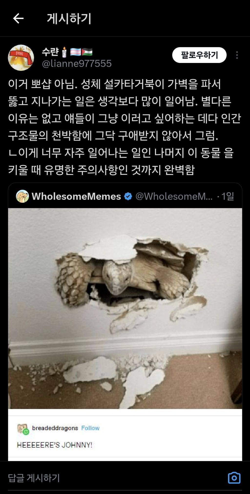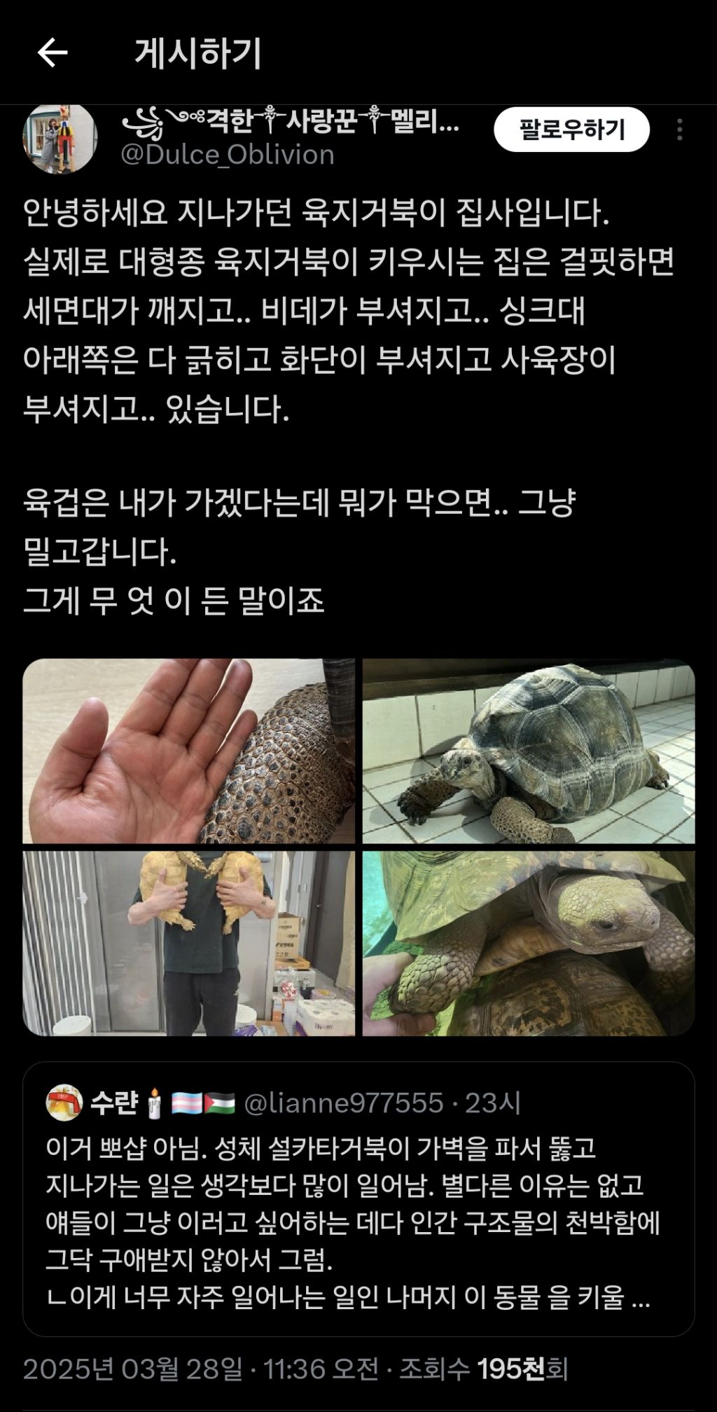 [스크랩] [흥미돋]벽을 뚫는 거북 설카타.twt 작성자설긔|작성시간25.09.13|조회수6,486 목록 댓글 20 글자크기 작게가 글자크기 크게가 출처: https://x.com/lianne977555/status/1905213671640621502?t=PZAPRrudQjsocWn6Q208kA&s=19X의 수랸🕯🏳️⚧️🇵🇸님(@lianne977555)이거 뽀샵 아님. 성체 설카타거북이 가벽을 파서 뚫고 지나가는 일은 생각보다 많이 일어남. 별다른 이유는 없고 얘들이 그냥 이러고 싶어하는 데다 인간 구조물의 천박함에 그닥 구애받지 않아x.com 다음검색 스크랩 원문 : *여성시대* 차분한 20대들의 알흠다운 공간 현재 게시글 추가 기능 열기 북마크 공유하기 신고 센터로 신고 댓글 댓글 20 댓글쓰기 답글쓰기 댓글 리스트 작성자북마크용 | 작성시간 25.09.13 오징어볶음 ㅅㅋㅋㅋㅋㅋㅋㅋ 작성자이초 | 작성시간 25.09.13 닉이 설갑차 ㅋㅋㅋㅋㅋㅋㅋㅋㅋㅋㅋ 작성자몽쉘카카오맛 | 작성시간 25.09.13 격한 사랑꾼님은 지금 두마리를 안고계신거야…? 작성자A Star Is Born | 작성시간 25.09.13 와.... 작성자꽃송이한아름 | 작성시간 25.09.13 귀여웡 댓글 전체보기