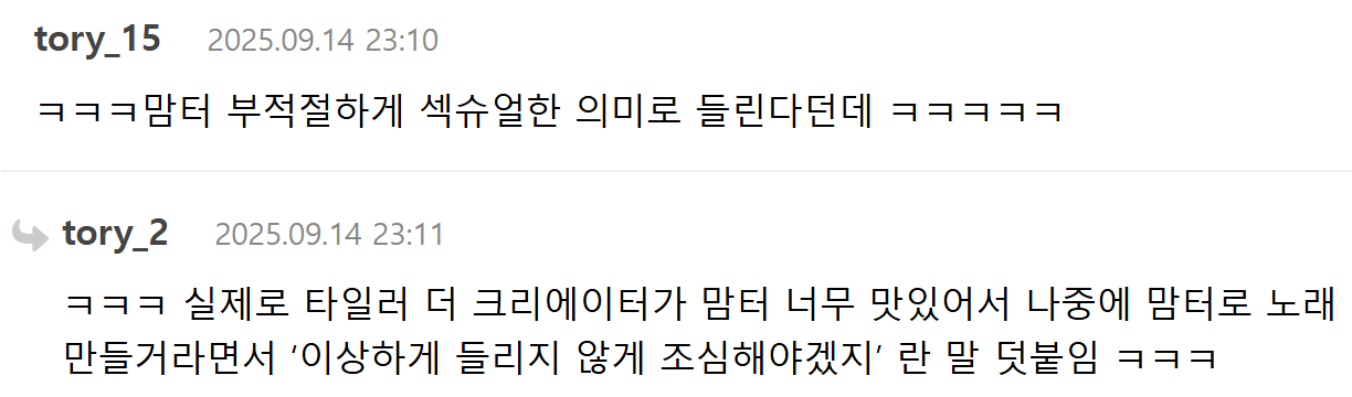 [흥미돋]내한공연에서 한국 브랜드 극찬한 래퍼 타일러.jpg 작성자귤토끼이|작성시간25.09.14|조회수33,675 목록 댓글 75 글자크기 작게가 글자크기 크게가 출처: https://www.dmitory.com/issue/381252345https://x.com/i/status/1967201098932109754https://x.com/i/status/1967186116332921103 다음검색 현재 게시글 추가 기능 열기 북마크 공유하기 신고 센터로 신고 댓글 댓글 75 댓글쓰기 답글쓰기 댓글 리스트 작성자롯데리아핫크리스피버거 | 작성시간 25.09.15 아 존나웃김 ㅅㅈㅋㅋㅋㅋ 작성자플로리다 | 작성시간 25.09.15 ㅋㅋㅋㅋㅋㅋㅋㅋㅋㅋㅋㅋㅋㅋㅋㅋㅋㅋㅋ 작성자셉템버이즈베스트 | 작성시간 25.09.15 ㄱㅇㄱ 작성자FREDERIC MALLE | 작성시간 25.09.15 존나웃겨 안되겠다 오늘 퇴근푸드 맘터 간닼ㅋㅋㅋ 작성자네가톤바 | 작성시간 25.09.15 오늘 점심 맘터다 댓글 전체보기