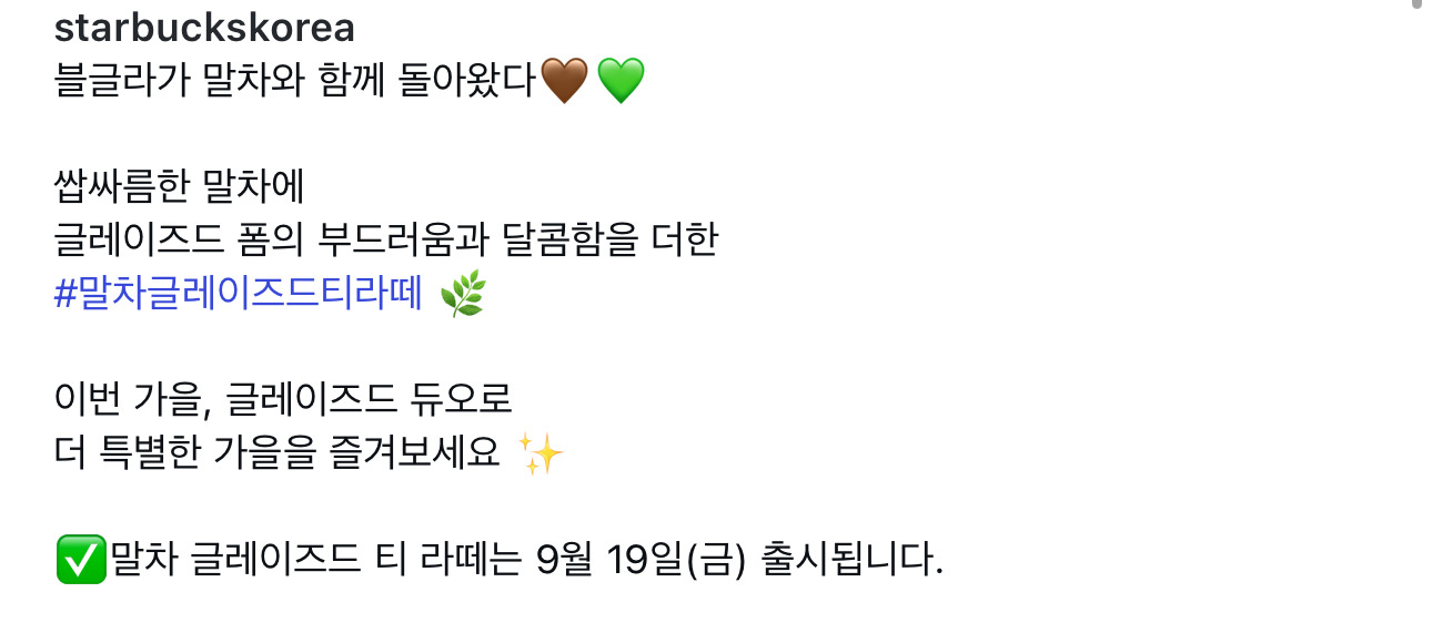 *여성시대* 차분한 20대들의 알흠다운 공간 [흥미돋]스타벅스 9/19 출시 예정인 음료 작성시간25.09.15|조회수72,312 목록 댓글 69 글자크기 작게가 글자크기 크게가 출처: 여성시대 바나나스플릿구슬 다음검색 현재 게시글 추가 기능 열기 북마크 공유하기 신고 센터로 신고 댓글 69 댓글 리스트 답댓글 작성시간 25.09.16 카페모카에 크림 올라간 맛.. 작성시간 25.09.15 미친 ㅠㅠㅠ 이제 진짜 가을이네 작성시간 25.09.16 후 디카페인으로조죠야지 작성시간 25.09.16 미쳤네 미쳤어 미쳤냐고 미쳤어 작성시간 25.09.16 너무 달아서 말차 맛 안나는거 별론데.. 시음만 해보고싶다 ㅋㅋㅋㅋ 카페 방문해 더 많은 댓글 만나기!