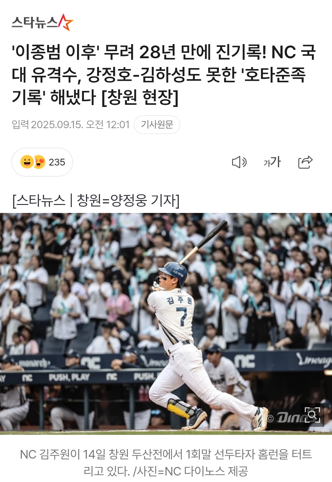 [여시뉴스데스크]'이종범 이후' 무려 28년 만에 진기록! NC 국대 유격수, 강정호-김하성도 못한 '호타준족 기록' 해냈다 [창원 현장]