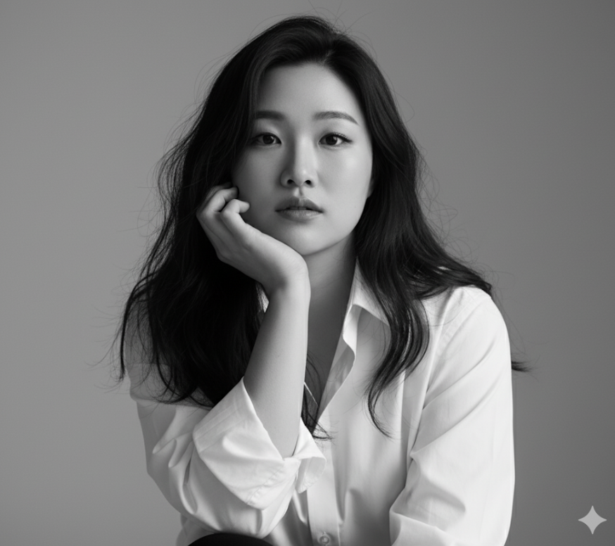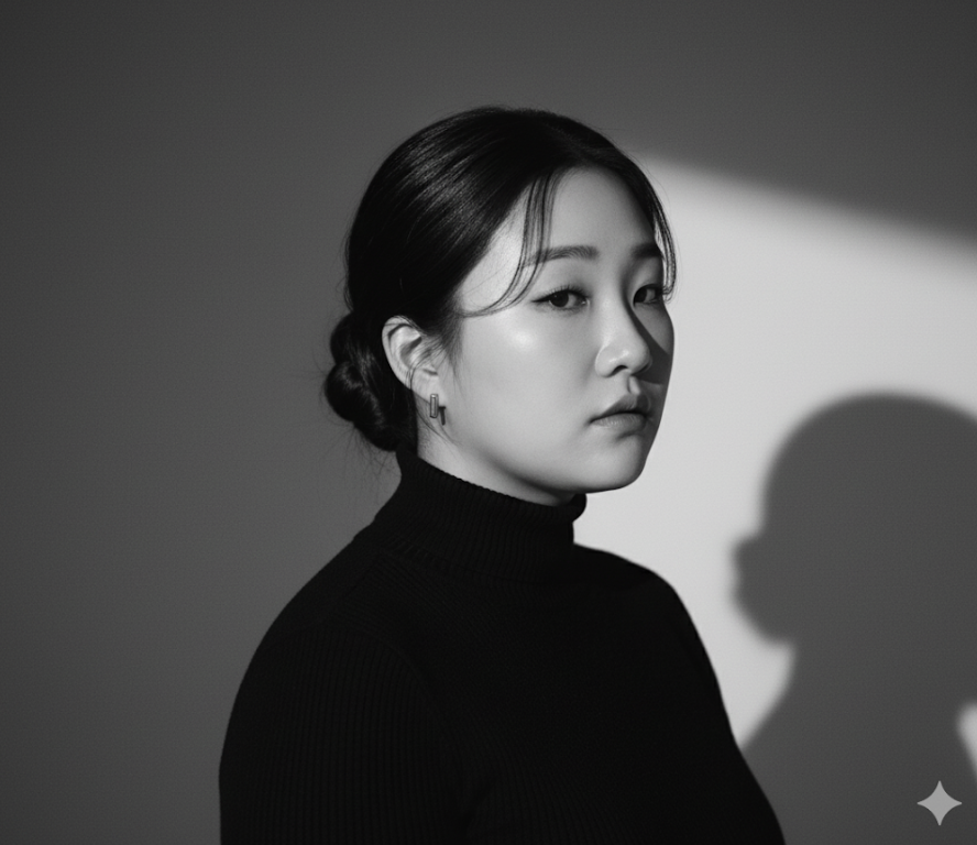 1.내가 지금 올린 사진으로 기본 얼굴로 만들어 주세요. 얼굴과 얼굴형은 최대한 바꾸지 않습니다. 세련된 검은색 터틀넥과 작고 시크한 금색 귀걸이를 착용하고 한국식 낮게 머리를 돌려서 묶은 한 여성의 고해상도 흑백 초상화입니다. 그녀는 미니멀한 스튜디오 환경에서 약간 옆으로 비스듬히 서 있고, 극적인 스튜디오 조명이 그녀의 얼굴과 배경에 대담한 기하학적 그림자를 만듭니다. 강한 빛줄기가 그림자를 가로지르고 있으며, 그녀의 표정은 차분하고 내성적이며 약간 멀어 보입니다. 전체적으로 영화 같은 분위기를 자아냅니다