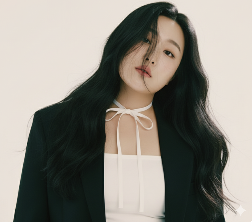 5.내가 지금 올린 사진으로 기본 얼굴로 만들어 주세요. 얼굴과 얼굴형은 최대한 바꾸지 않습니다.고급 패션 스튜디오에서 사진 속 피부색과 긴 헝클어진 검은 머리를 가진 여성의 사진을 만들어주세요. 그녀는 검은색 오버사이즈 블레이저를 흰색 튜브 톱 위에 겹쳐 입고, 목에는 얇은 흰색 리본을 나비넥타이 모양으로 묶었습니다. 그녀는 머리를 살짝 옆으로 기울이고 꿈결 같고 차분한 표정으로 카메라를 부드럽게 응시하는 포즈를 취합니다. 얼굴 위로 한 가닥의 머리카락이 느슨하게 떨어져 우아함을 더합니다. 부드럽게 확산된 조명과 평평한 흰색 배경을 사용합니다.