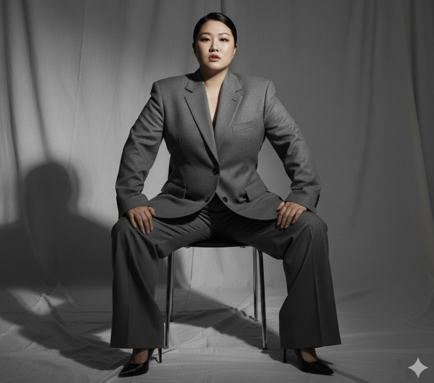 6. 내가 지금 올린 사진으로 기본 얼굴로 만들어 주세요. 얼굴과 얼굴형은 최대한 바꾸지 않습니다. 세련된 스튜디오에서 의자에 앉아 있는 자신감 넘치는 여성의 하이패션 화보입니다. 그녀는 오버사이즈의 회색 슈트를 입고 와이드 팬츠와 검은색 하이힐을 매치했습니다. 배경은 무채색 천이 드리워진 미니멀한 공간이며, 부드러운 그림자가 드리운 영화 같은 조명이 특징입니다. 다리를 벌리고 손을 자연스럽게 무릎에 올린 강하고 세련된 포즈를 취하고 있으며, 시크한 헤어스타일과 은은한 메이크업으로 전문적인 패션 잡지인 보그(Vogue) 스타일의 편집 이미지를 연출했습니다.